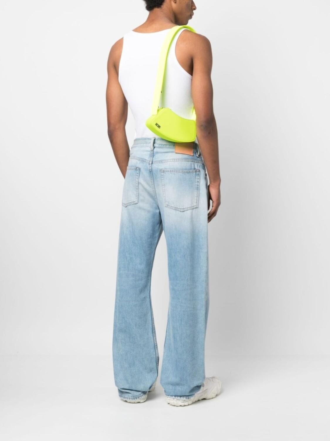 Флуоресцентный желтый, телячья кожа, серебристый металлический логотип, нашивка с логотипом внутри, тисненый логотип внутри, застежка на молнии сверху, съемный ремень на плечо и основное отделение.