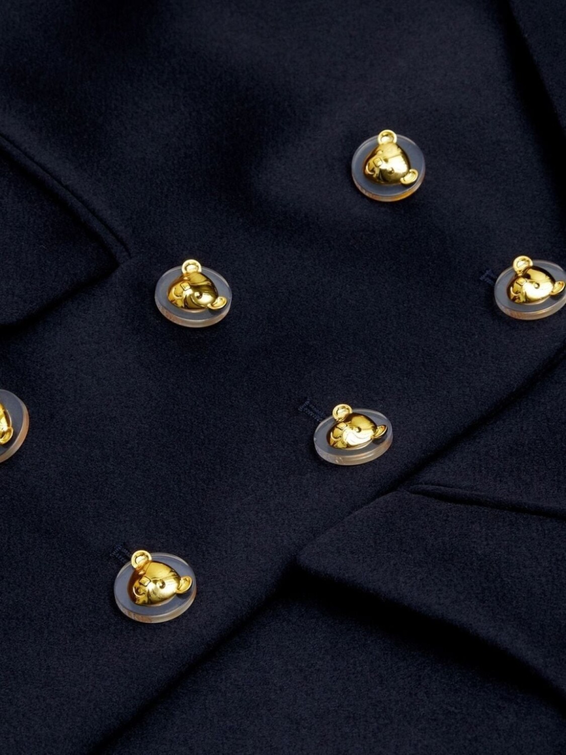 Темно-синий, шерсть, двубортная застежка на кнопки, передние карманы с клапаном, длинные рукава и прямой подол.
