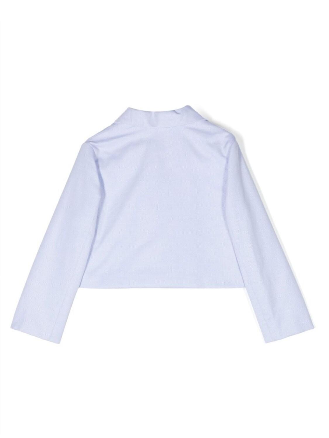 Светло-бирюзовый, хлопок, воротник Питер Пэн, застежка на пуговицах спереди, длинные рукава и укороченная длина.