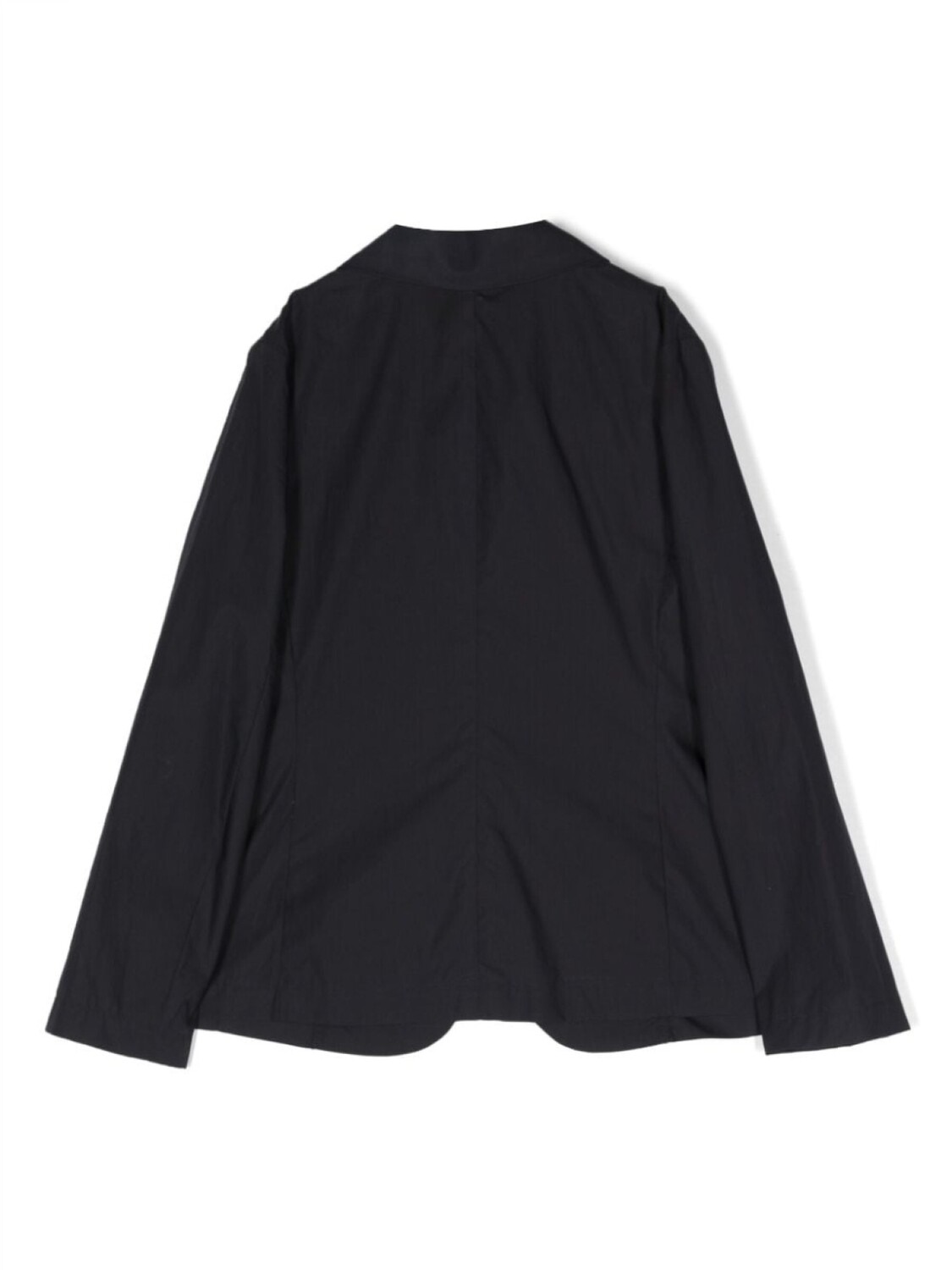 Темно-синий, хлопок, нашивка с логотипом сбоку, зазубренные лацканы, застежка на пуговицах спереди, два прорезных кармана по бокам и длинные рукава.