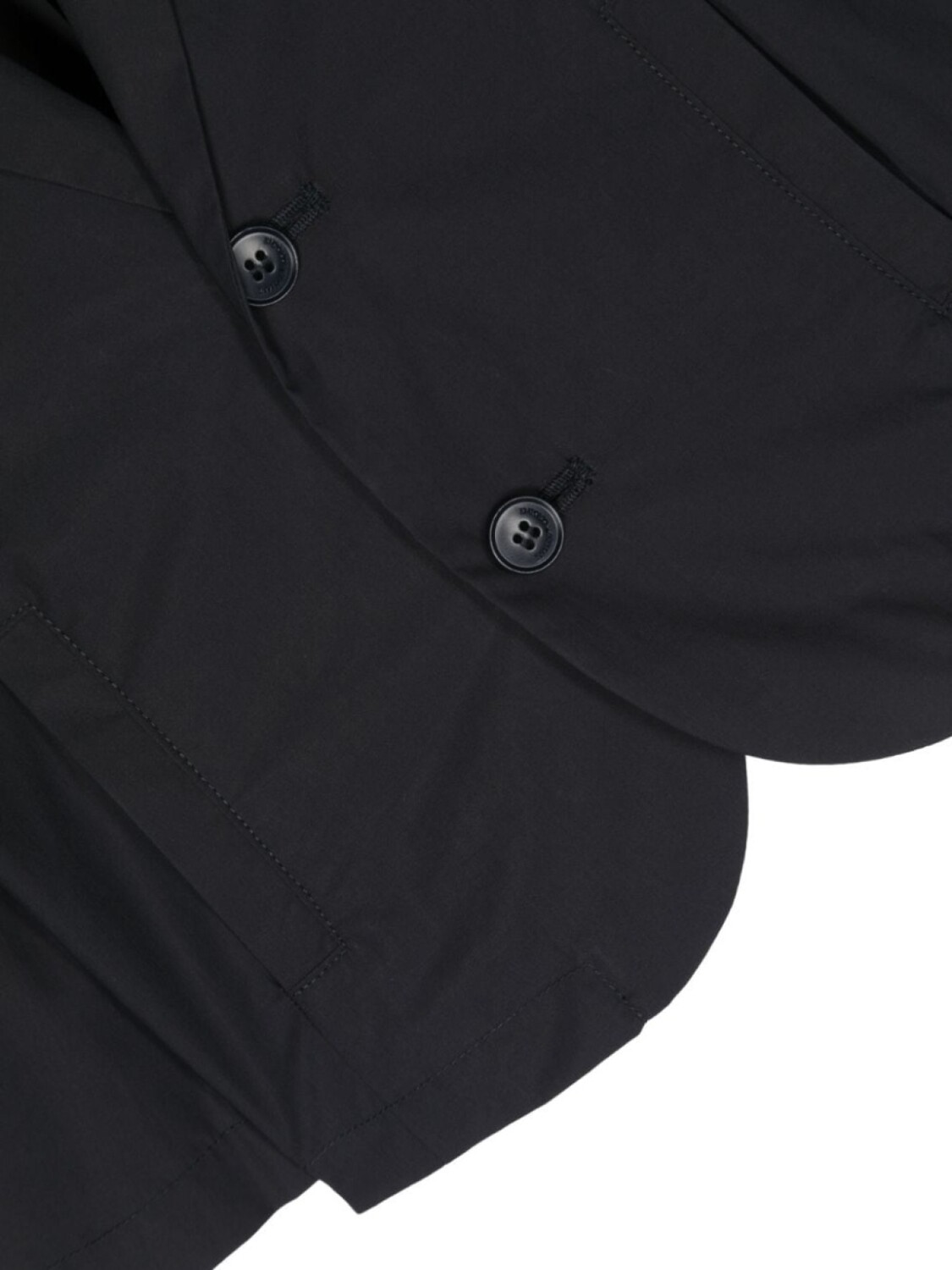Темно-синий, хлопок, зазубренные лацканы, застежка на пуговицах спереди, длинные рукава, два передних кармана с листочкой и прямой подол.