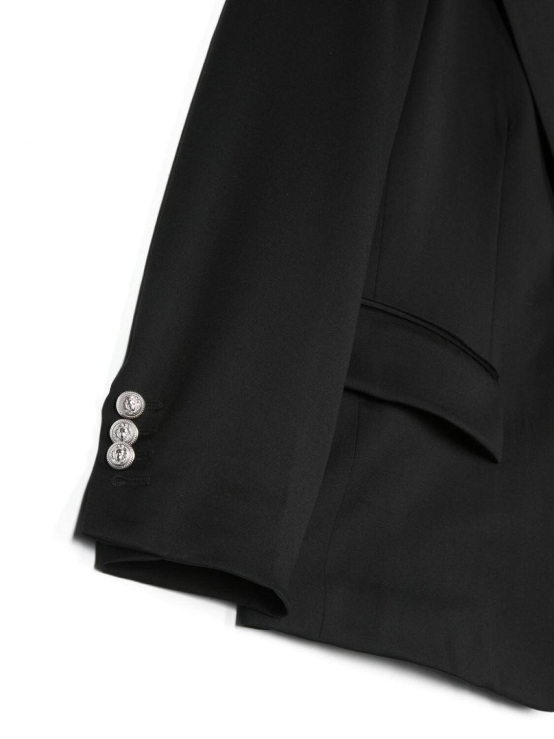 Черный, необработанная шерсть, широкие заостренные лацканы, застежка на пуговицы, прорезной карман на груди, два передних кармана с клапанами, манжеты на пуговицах, длинные рукава и шлица по центру сзади.