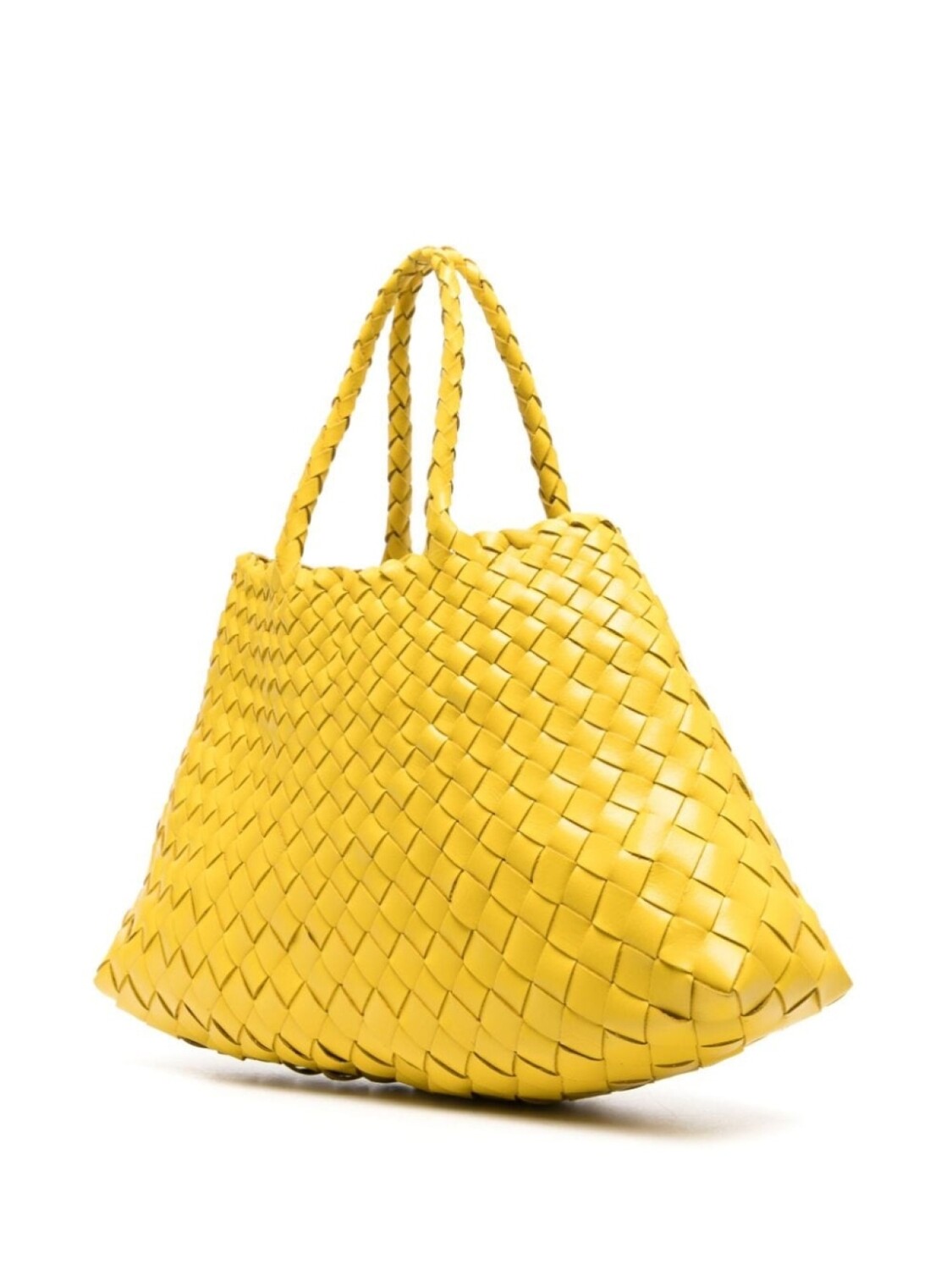 Желтый, телячья кожа, переплетенный дизайн и круглые ручки.