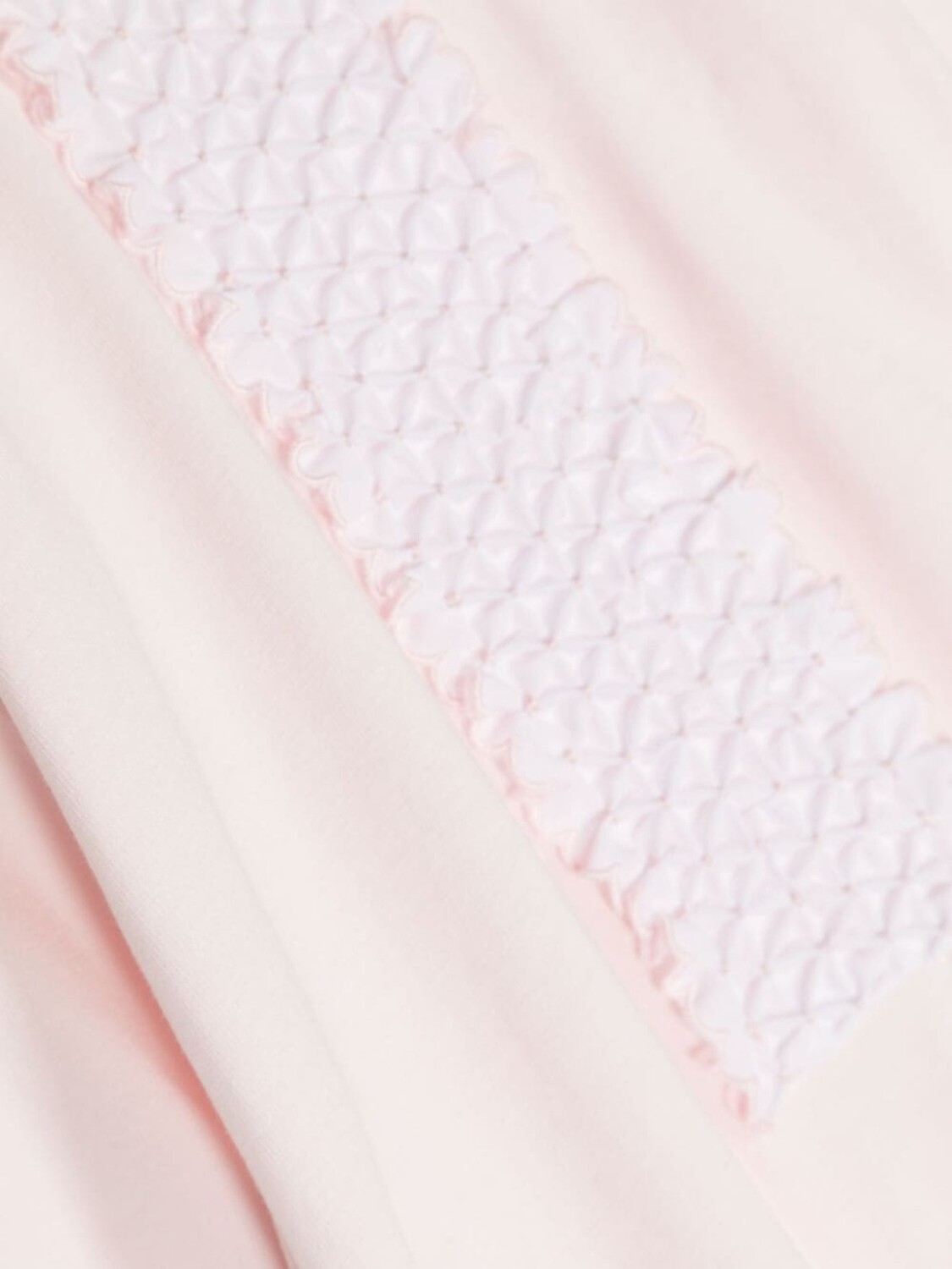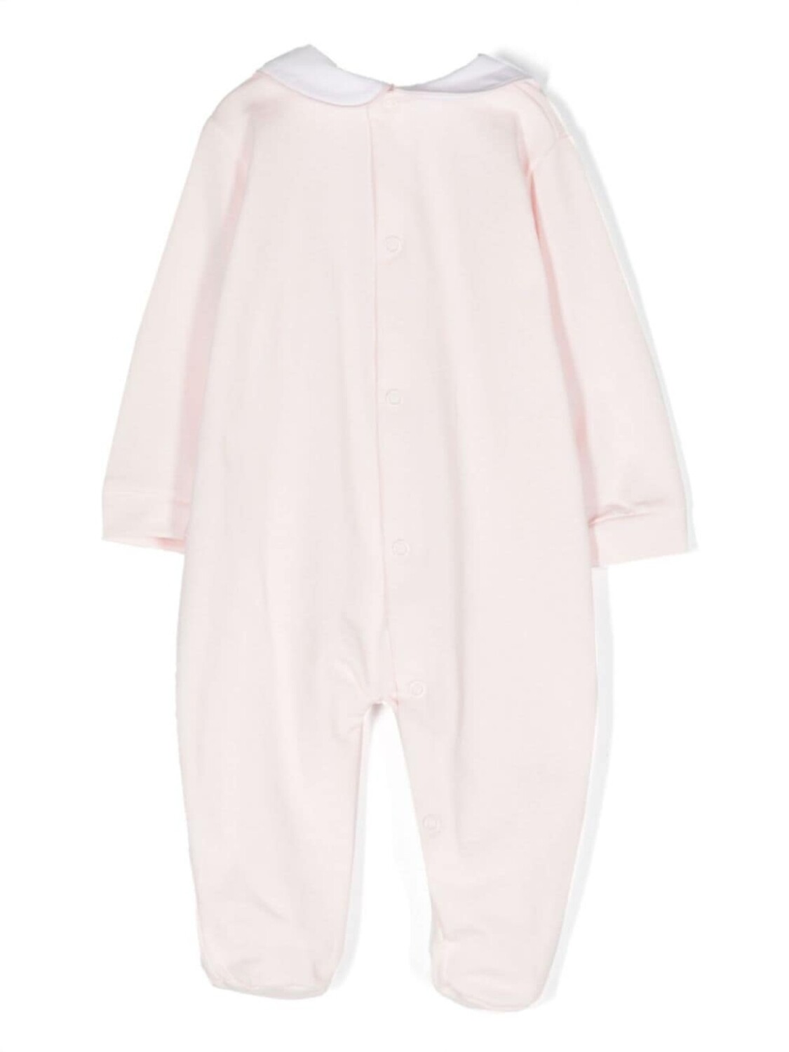 Светло-розовый, эластичный хлопок, ткань джерси, складки спереди, воротник Питер Пэн, длинные рукава, пинетки, застежка на кнопки сзади
