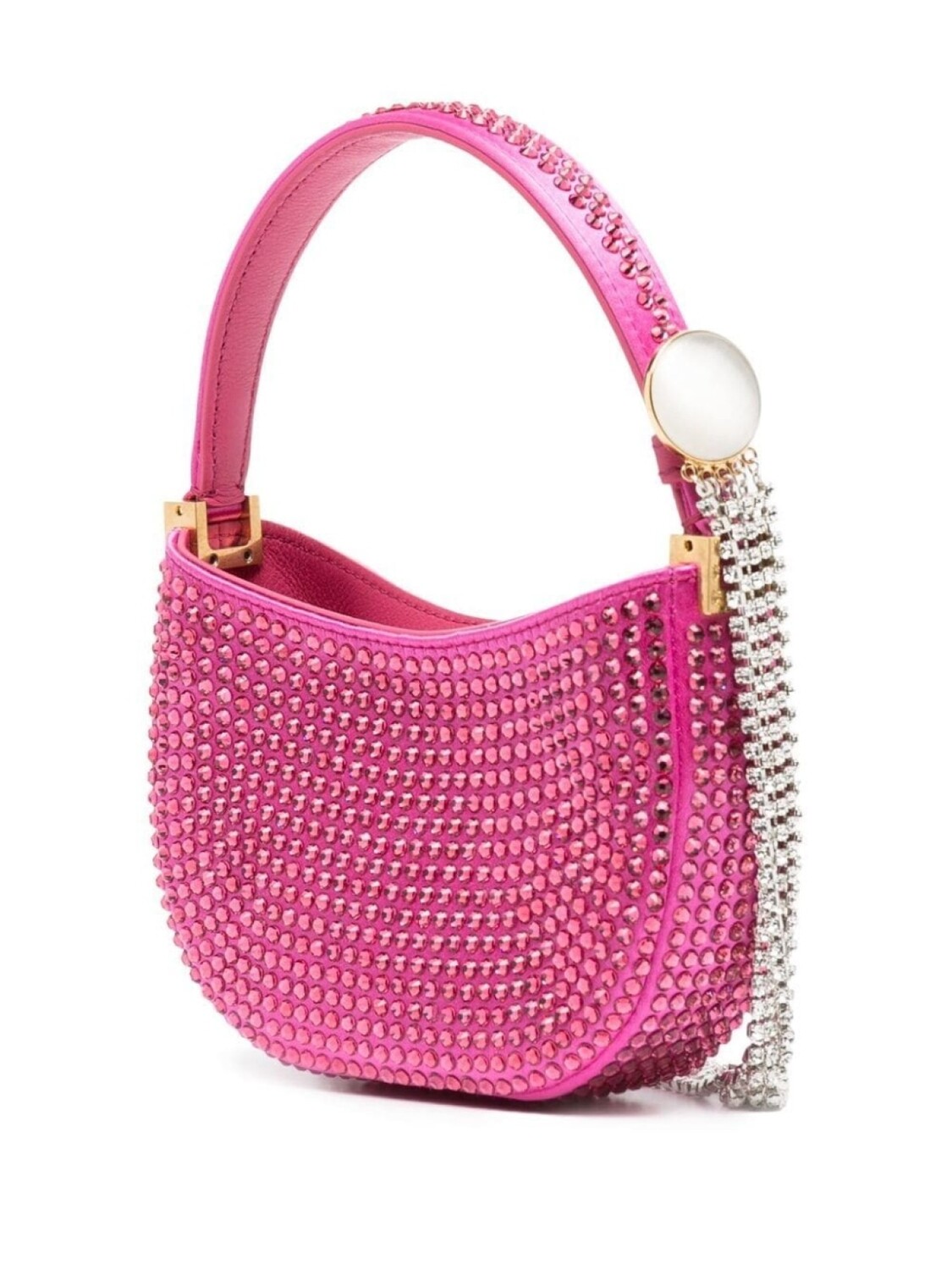 Нежно-розовый, сатиновая фактура, декор из кристаллов, тисненый логотип внутри, основное отделение, потайная застежка на магните, верхняя ручка и съемный цепочный ремень на плечо.