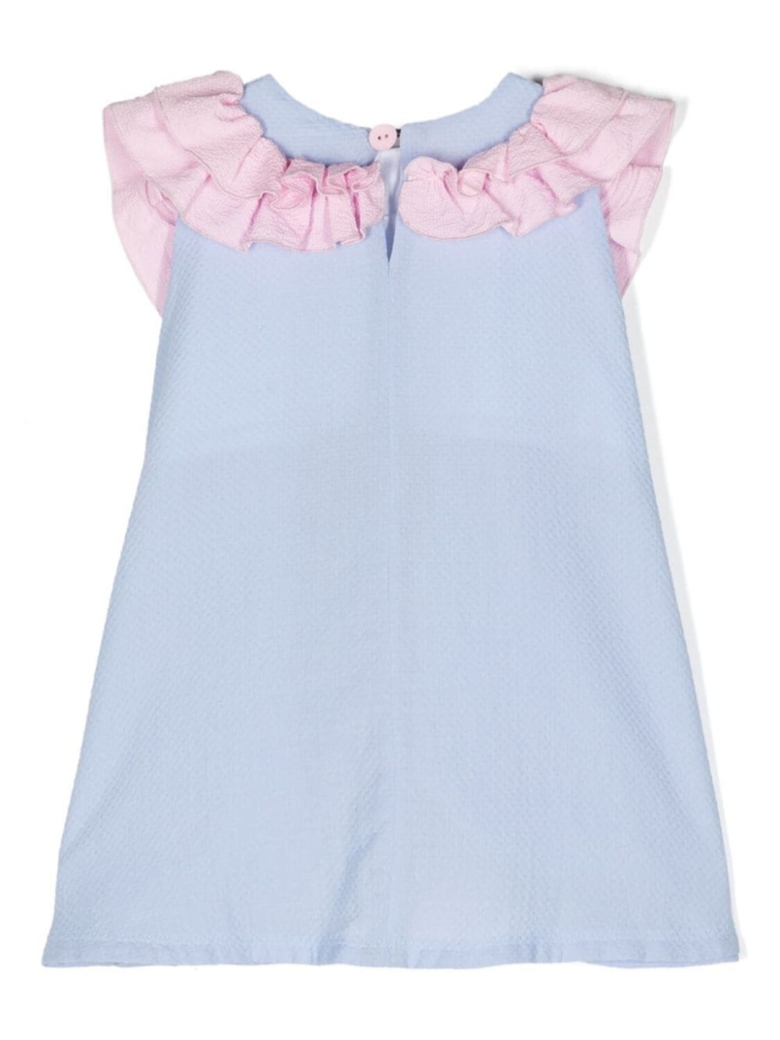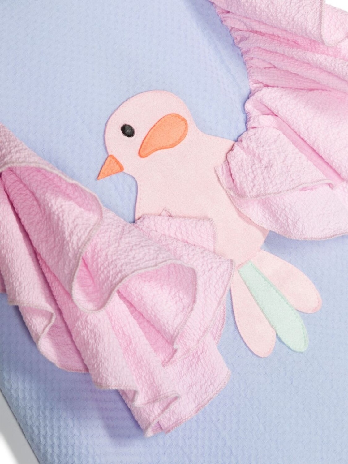 Синий/розовый, хлопок, сирсакер, аппликация с изображением птицы, круглый вырез, застежка на пуговицу сзади, вырез сзади, расклешенные рукава, А-образный силуэт, прямой подол, длина по колено
