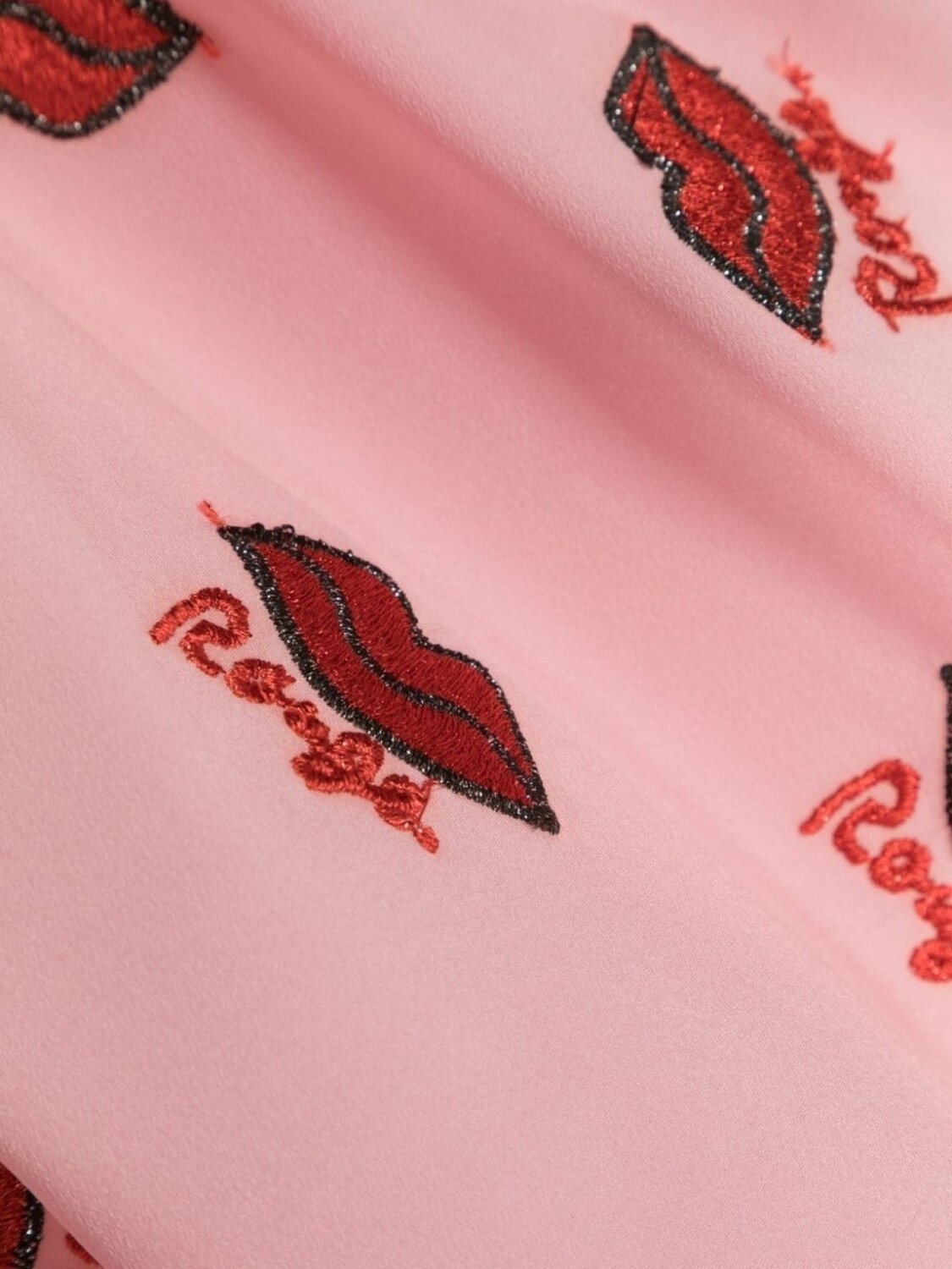 Сплошной графичный принт, узор с изображением губ, без рукавов, присборенный воротник, бант, металлический логотип, застежка на молнии сзади и прямой подол.