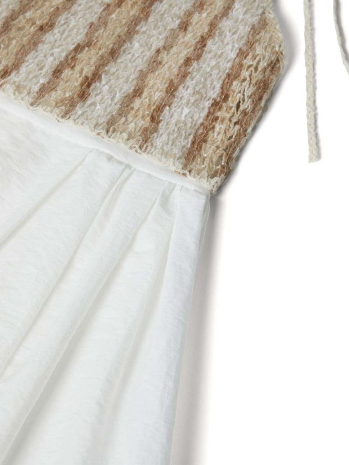 Цвет слоновой кости, смесовый хлопок, вставки, сатиновая фактура, украшение из пайеток, завязки вокруг шеи и неравномерный подол.