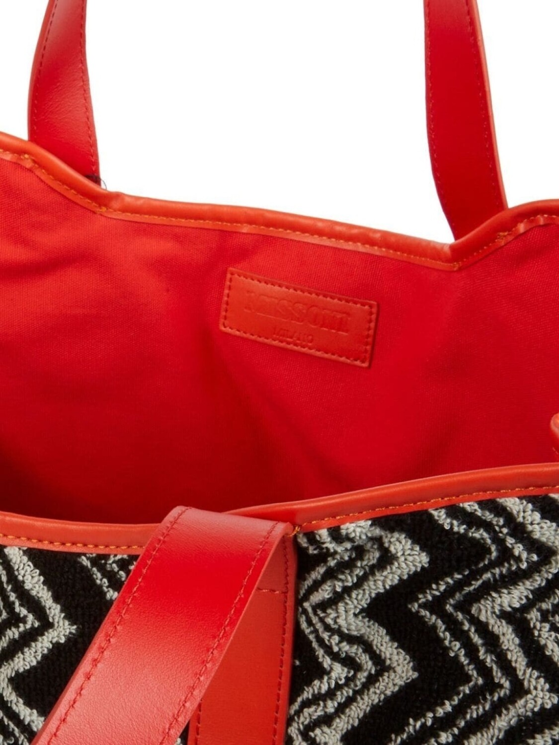 Черный/белый, хлопок/кожа, зигзагообразный принт, махровый эффект, кожаная отделка, нашивка с логотипом внутри, две длинные верхние ручки и основное отделение.