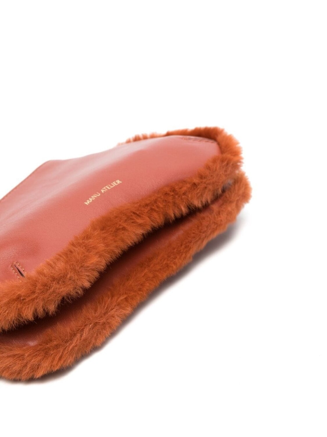 Кирпично-красный, телячья кожа, отделка из искусственного меха, тисненый логотип спереди, застежка на молнии сверху и регулируемый ремень на плечо.