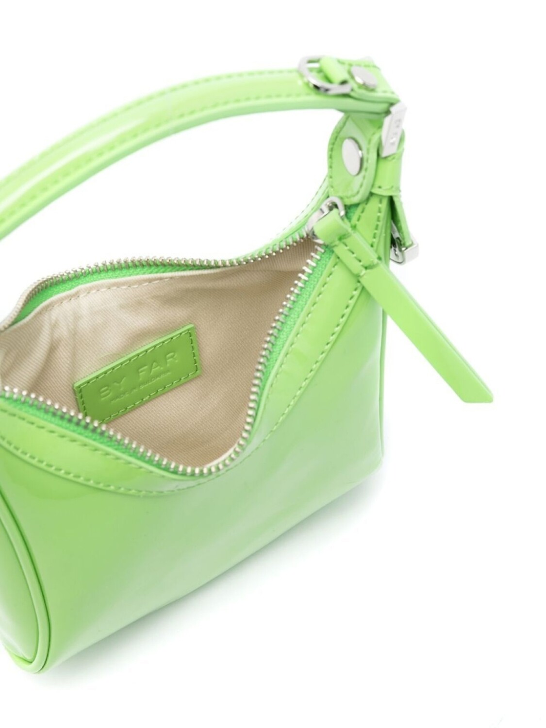 Светло-зеленый, телячья кожа, лакированная отделка, серебристая фурнитура, ручка с плоским верхом, застежка на молнии сверху, съемный регулируемый ремень на плечо, основное отделение и нашивка с логотипом внутри.