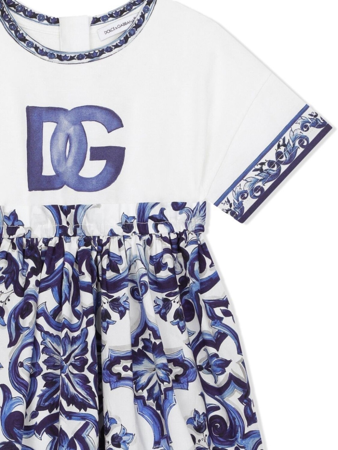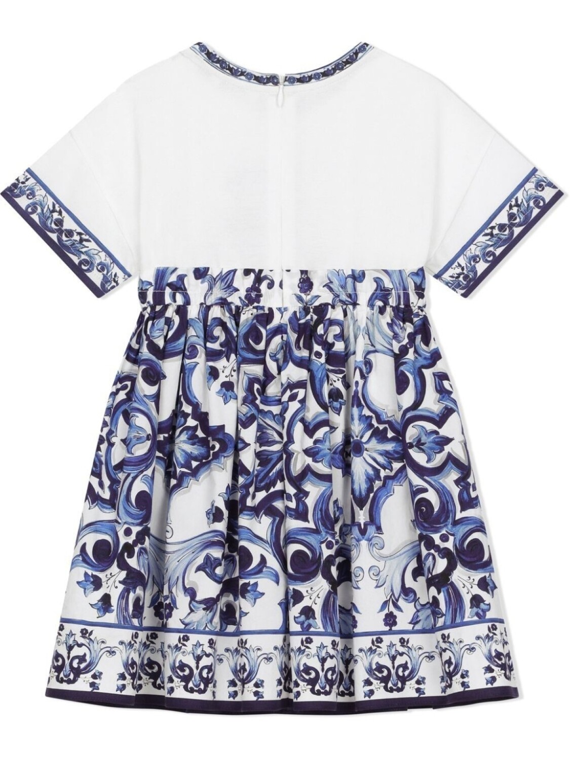 Синий, белый, хлопок, принт Majolica, принт с логотипом на груди, круглый вырез, потайная застежка на молнии сзади, плиссированная юбка и прямой подол.