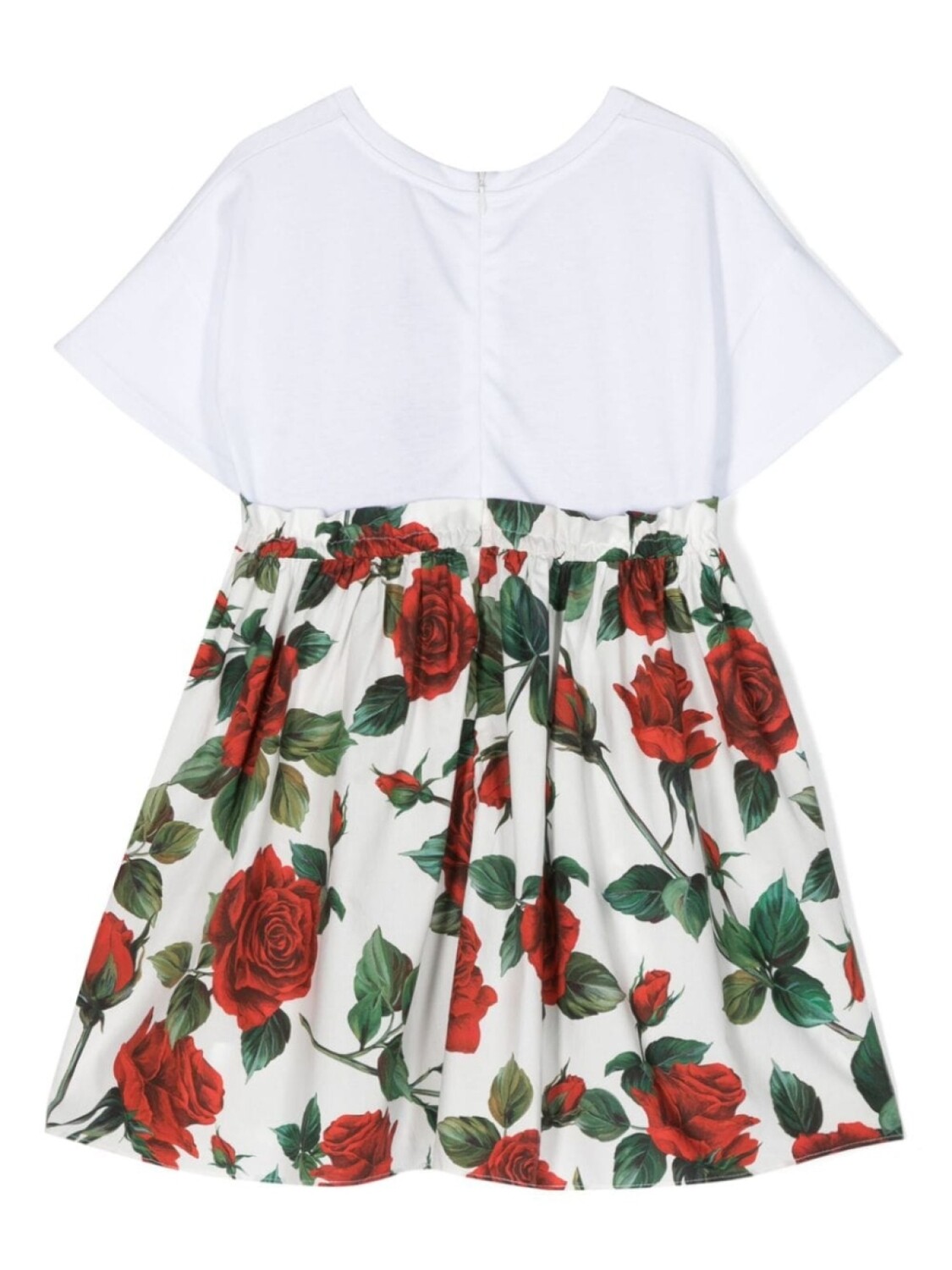 Белый, красный, зеленый, хлопок, сплошной принт с изображением роз, логотип спереди, круглый вырез, потайная застежка на молнии сзади, короткие рукава, юбка А-образного силуэта, плиссированная юбка и прямой подол.