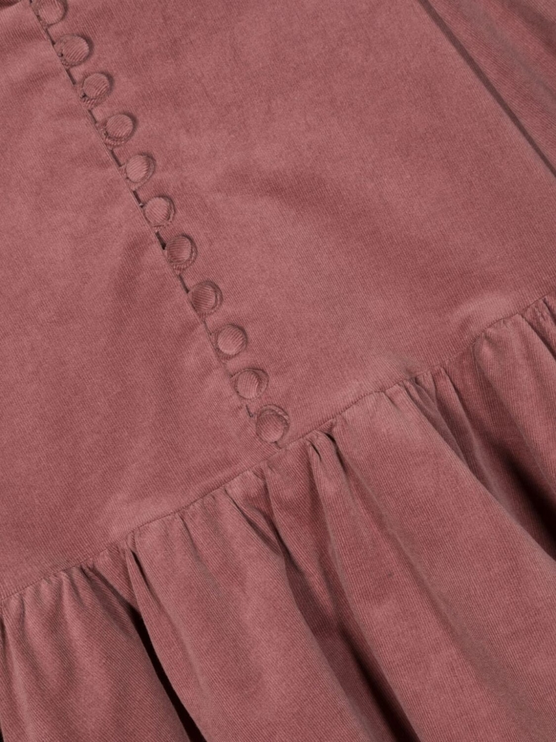 Темно-розовый, эластичный хлопок, воротник-стойка, застежка на пуговицах спереди, длинные рукава, эластичные манжеты и прямой подол.