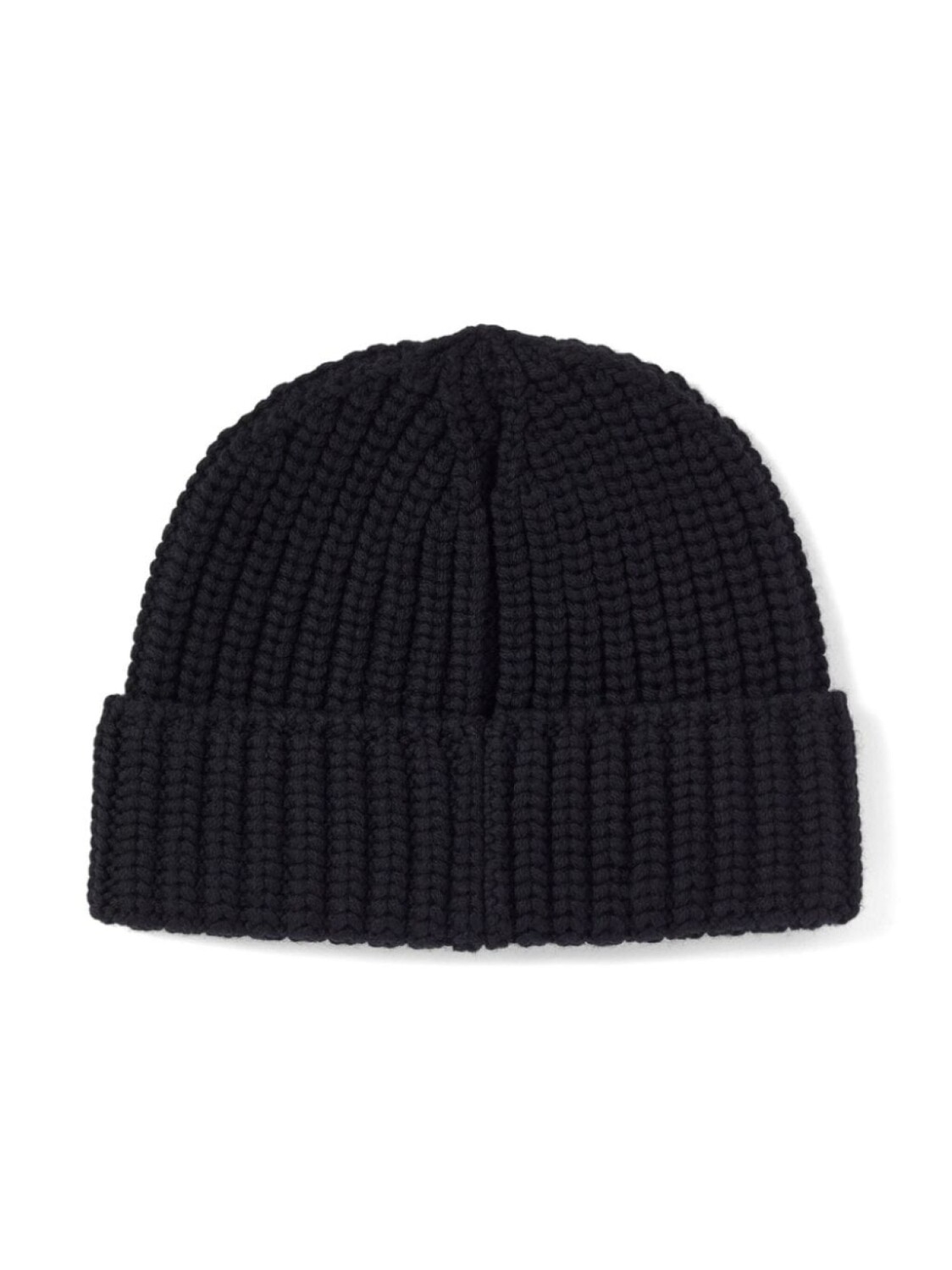 Черный, необработанная шерсть, трикотаж в крупный рубчик, вышитый логотип спереди, модель без застежки и подвороты.