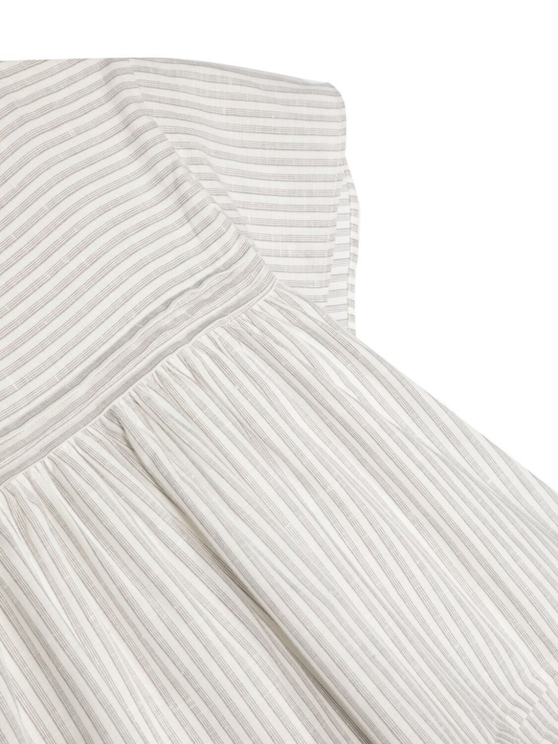 Серый/белый, хлопок, узор в горизонтальную полоску, узор в диагональную полоску, круглый вырез и застежка на пуговицы сзади.