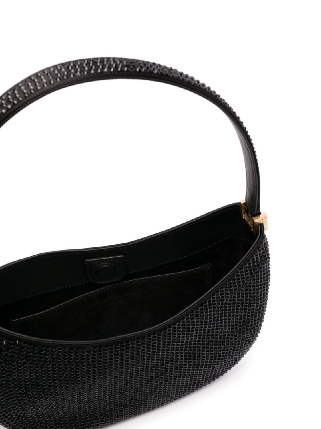 Черный, телячья кожа, декор из кристаллов, ремень на плечо, потайная застежка на магните, внутренние накладные карманы, тисненый логотип внутри, кожаная подкладка, золотистая фурнитура и закругленная форма.