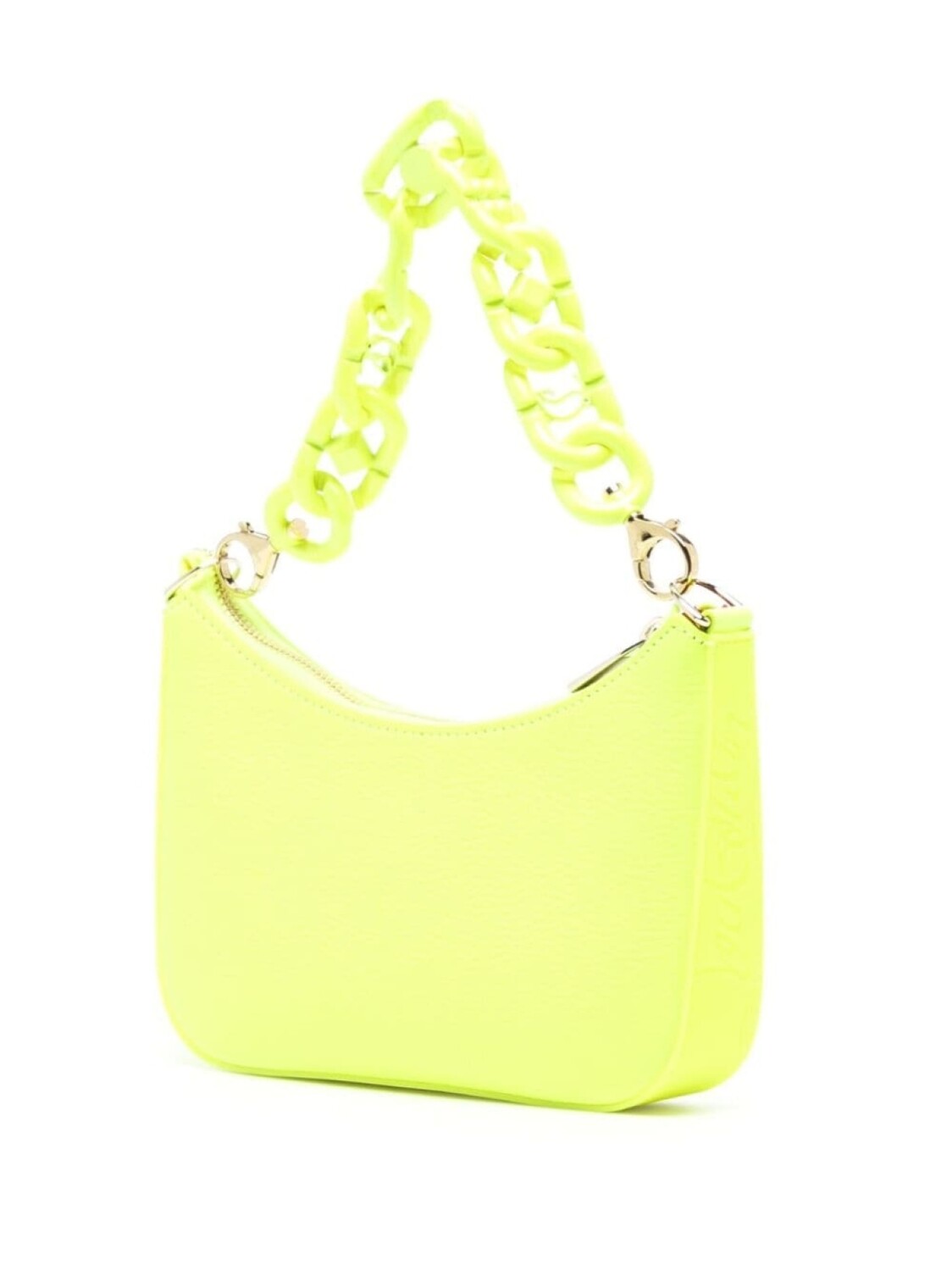Флуоресцентный желтый, телячья кожа, зернистая текстура, застежка на молнии сверху, съемный верхний ремень-цепочка, съемный регулируемый ремень на плечо, основное отделение и нашивка с логотипом внутри.