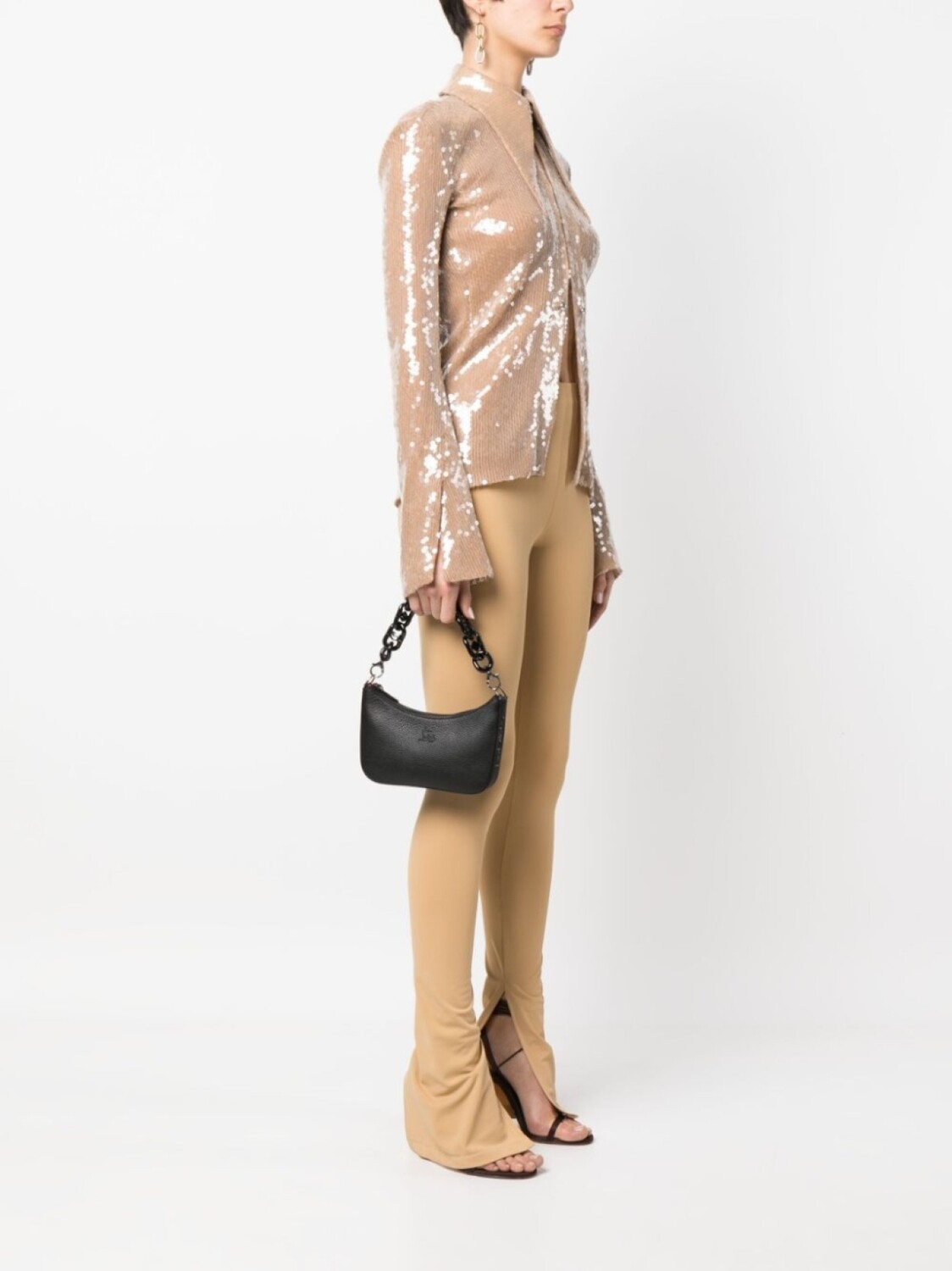 Черный, алый, телячья кожа, зернистая текстура, тисненый логотип спереди, тисненый логотип сбоку, серебристая фурнитура с выгравированным логотипом, съемный цепочный ремень на плечо, съемный регулируемый ремень на талию из кожи и металла, застежка на молнии сверху, основное отделение и нашивка с логотипом внутри.