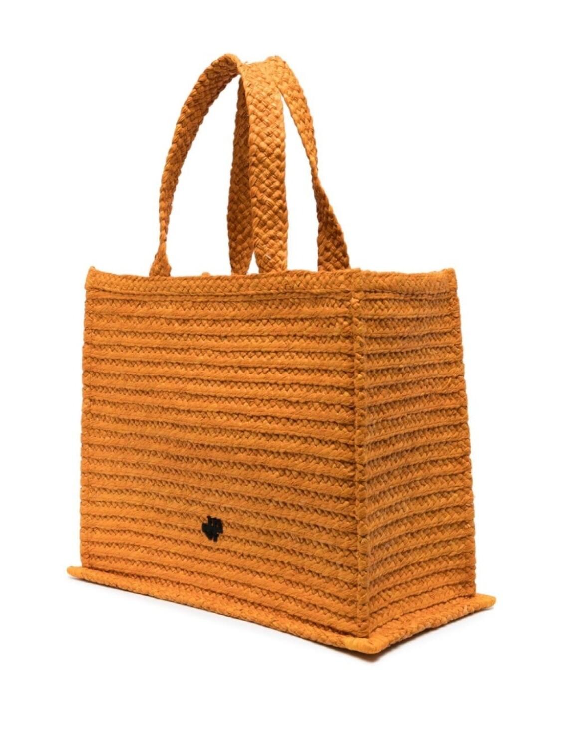 Оранжевый, черный, рафия, нашивка с логотипом спереди, две верхние ручки, застежка с тисненым логотипом и нашивка с логотипом внутри.