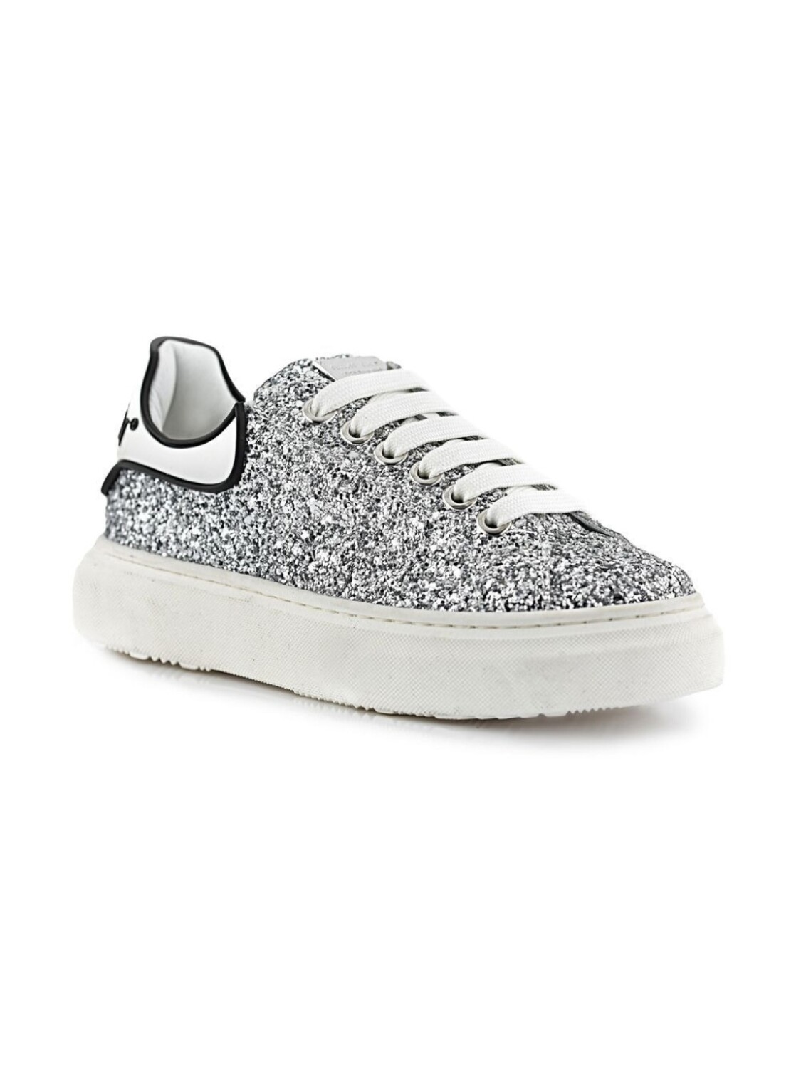 Блестящий материал, нашивка с логотипом на язычке, контрастный задник, шнуровка спереди, закругленный носок, стелька с логотипом и плоская резиновая подошва.
