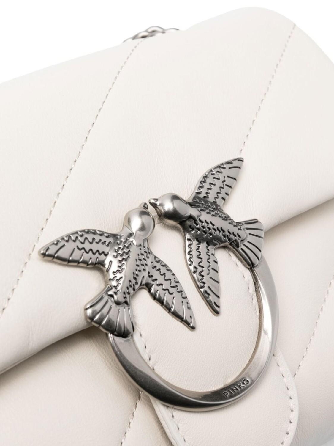 Белый, овечья кожа, стеганая отделка, пряжка Love Birds, серебристая фурнитура, откидной клапан на магните и ремешок-цепочка на плечо.