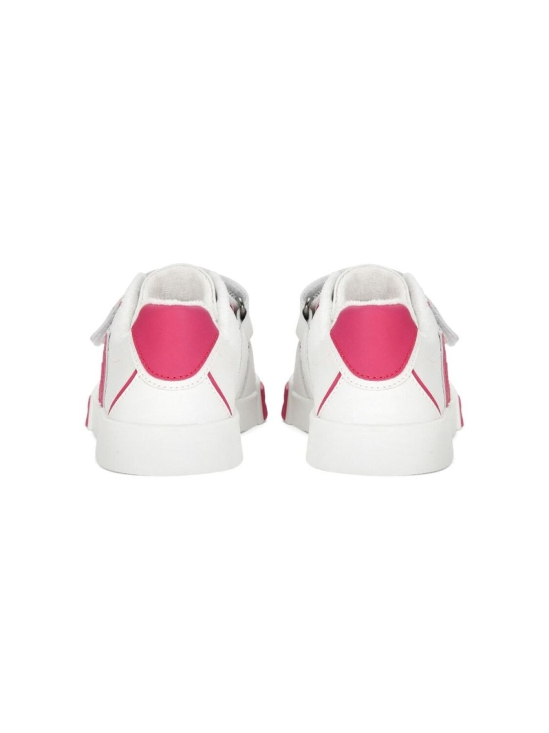 Белый, ярко-розовый, телячья кожа, закругленный носок, контрастный носок, застежка на липучке спереди, тисненый логотип сбоку, контрастный задник и плоская резиновая подошва.