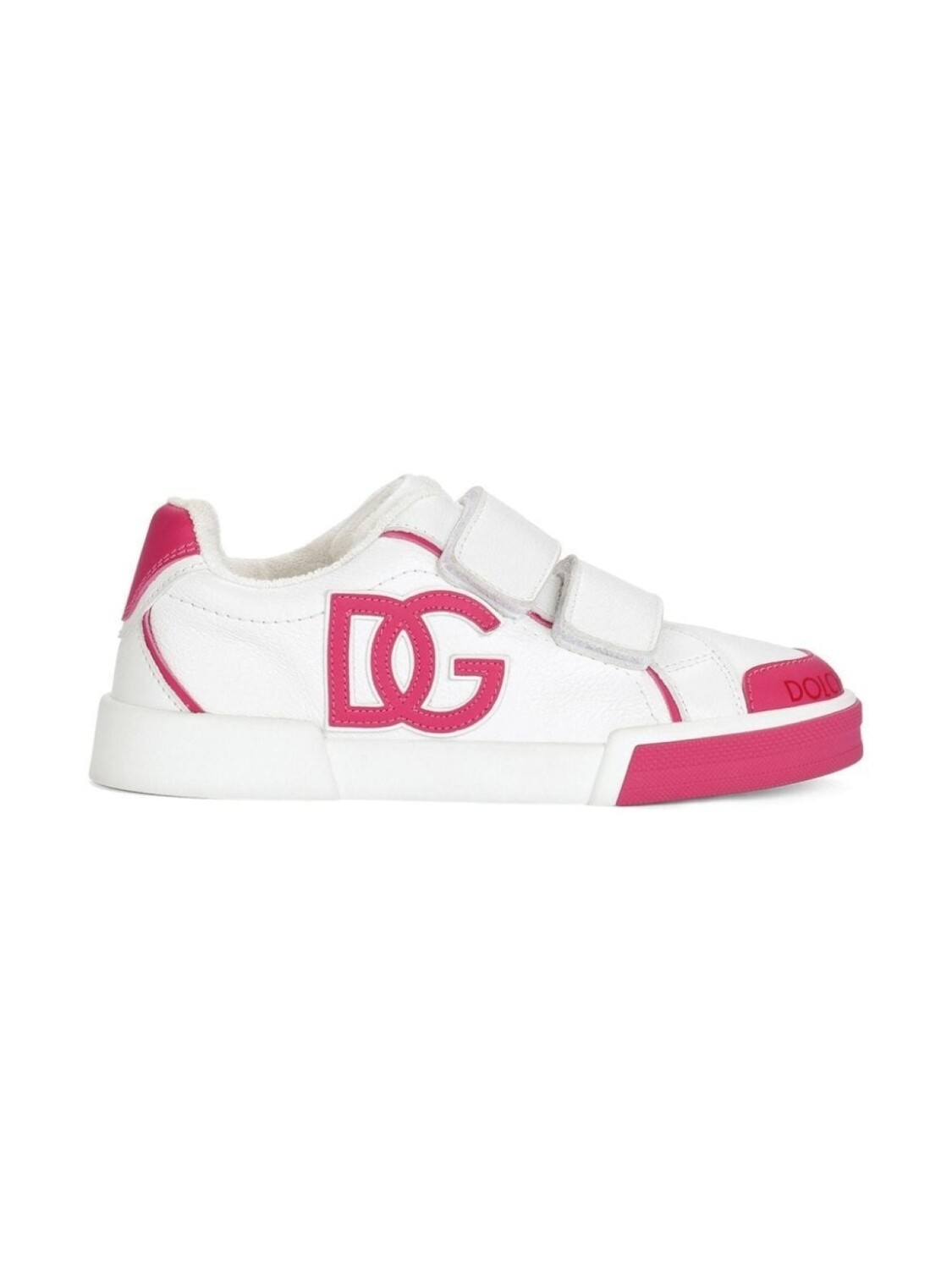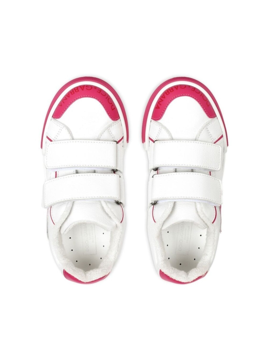 Белый, фуксия, телячья кожа, нашивка с логотипом сбоку, стелька с логотипом, закругленный носок, застежка на липучке спереди и плоская резиновая подошва.