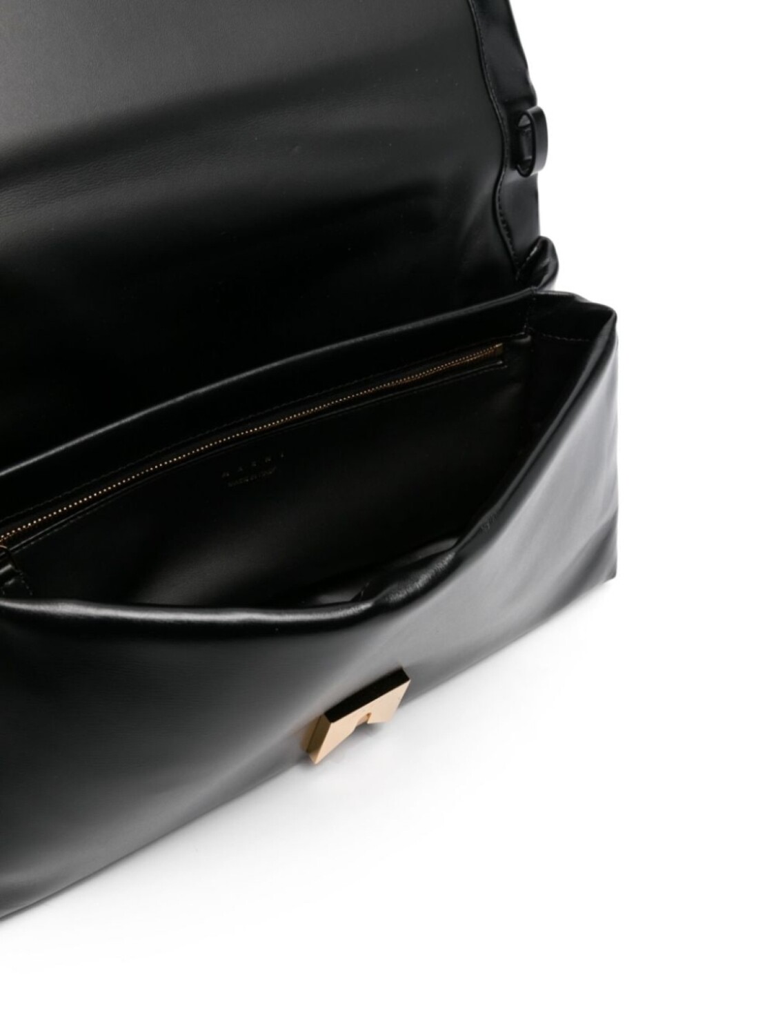 Черный, телячья кожа, гладкая текстура кожи, тисненый логотип сзади, золотистая фурнитура с выгравированным логотипом, откидной клапан, ручка с плоским верхом, застежка с клапаном спереди, ручка с плоским верхом, съемный регулируемый ремень на плечо, основное отделение, внутренний карман на молнии, тисненый логотип внутри и подкладка из хлопка.