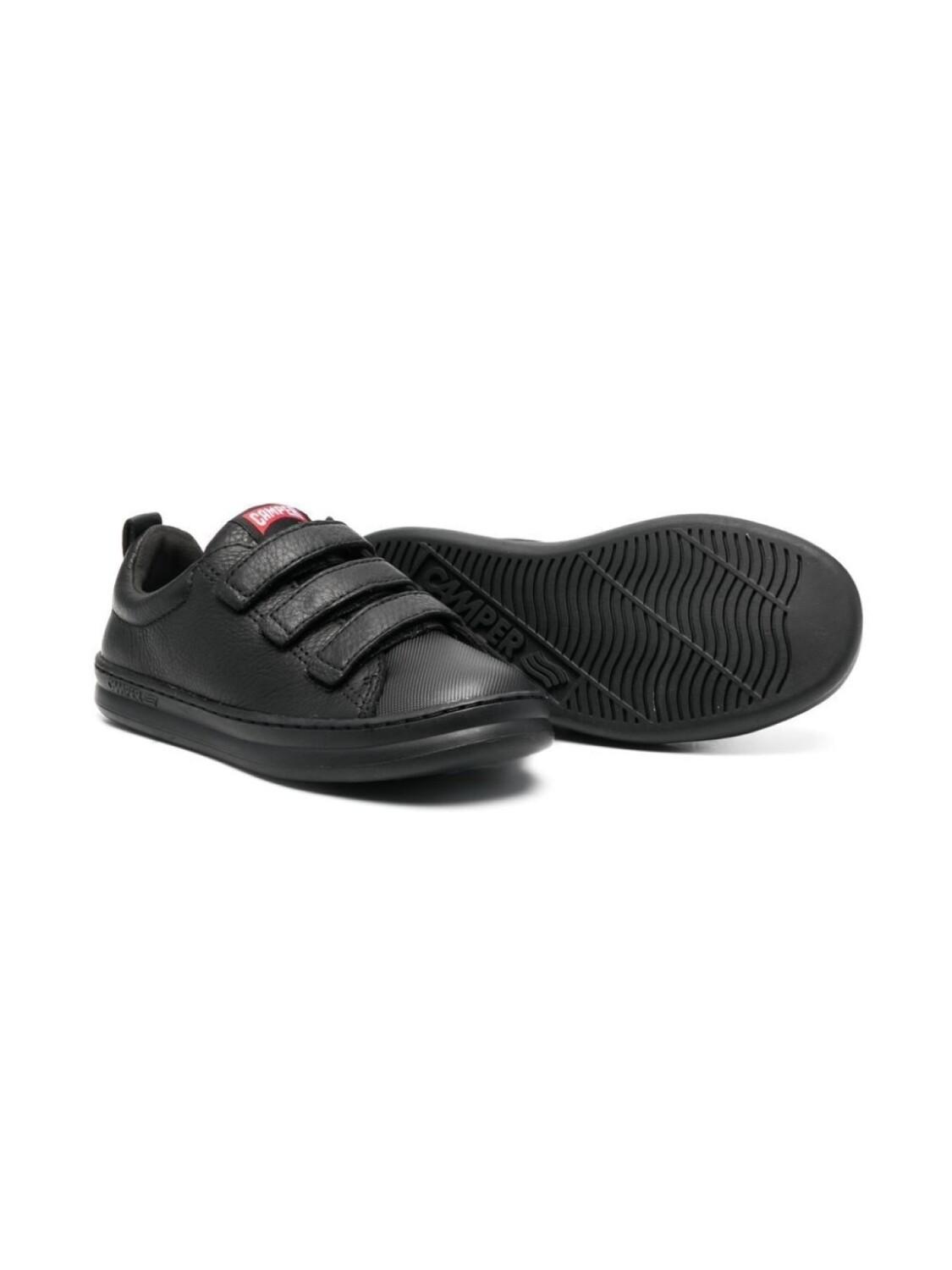 Черный, кожа, переработанный полиэстер, нашивка с логотипом на язычке, закругленный носок, застежка на липучке спереди и плоская резиновая подошва.