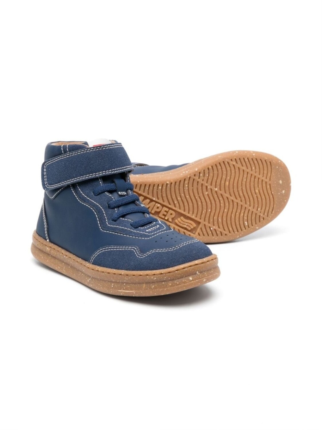 Синий, переработанный полиэстер, кожа, нашивка с логотипом на язычке, шнуровка спереди, застежка на липучке спереди, контрастная строчка, закругленный носок, стелька с логотипом и плоская резиновая подошва.
