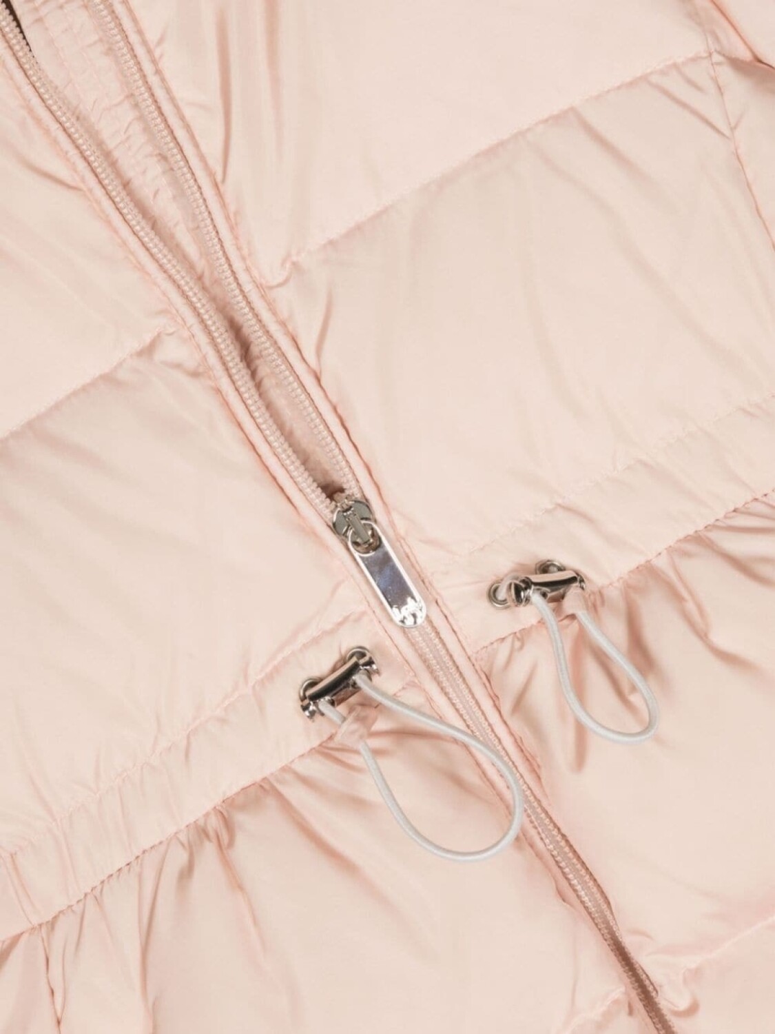 Светло-розовый, наполнитель из пуха и перьев, дутый материал, логотип-аппликация, классический капюшон, воротник-стойка, двусторонняя молния спереди, кулиска на талии, два прорезных кармана сбоку, длинные рукава и прямой подол.