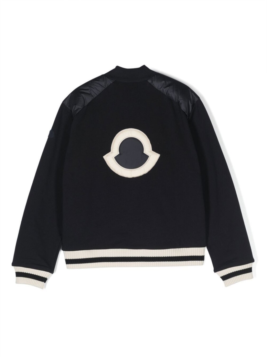 Темно-синий, гусиный пух, хлопок, дутый материал, нашивка с логотипом сзади, воротник-стойка в рубчик, контрастные рукава, длинные рукава и застежка на молнии спереди.