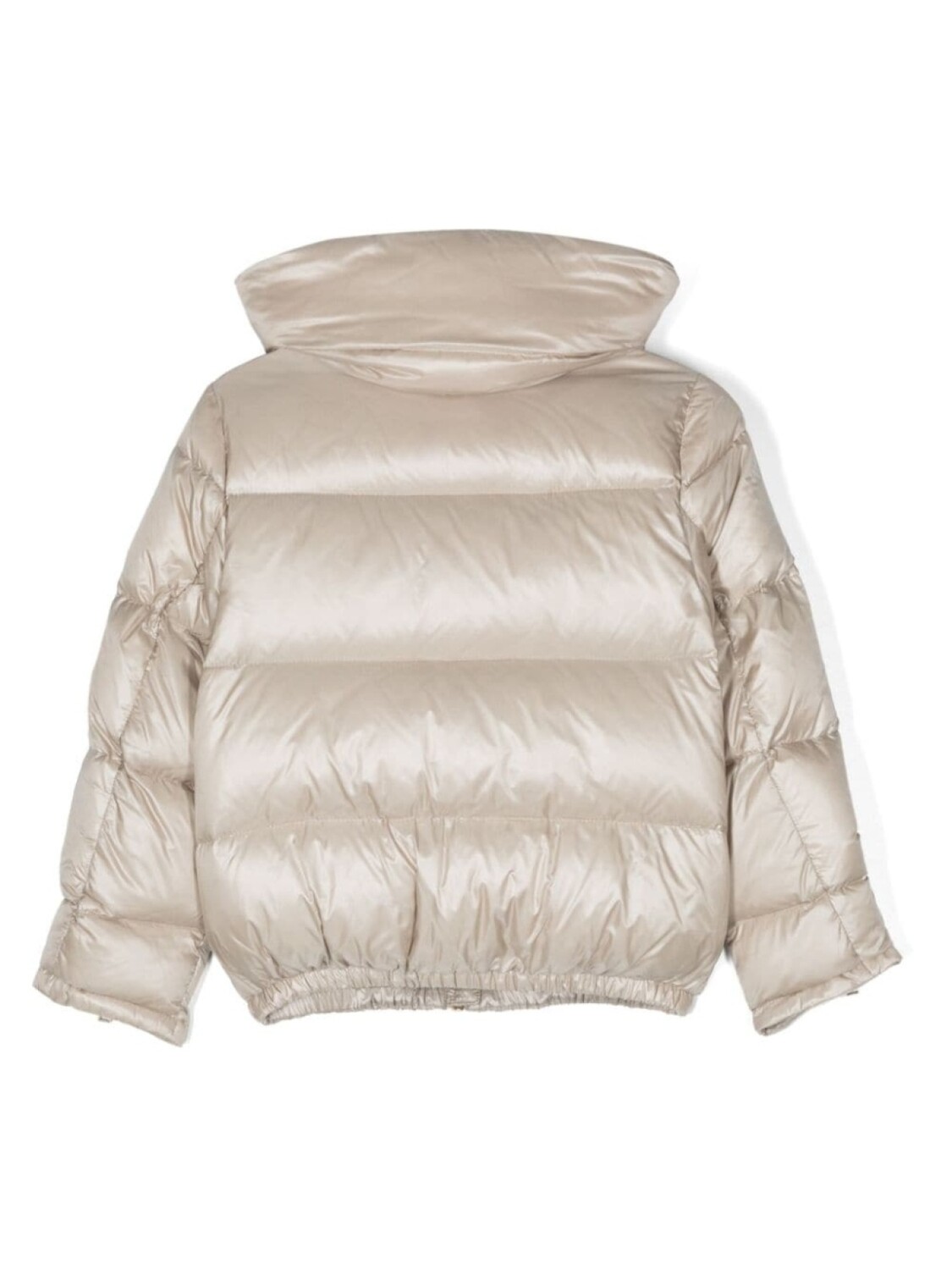 Наполнитель из пуха и перьев, дутый материал, вышитый логотип на груди, воротник-стойка, застежка на молнии спереди, длинные рукава, манжеты на молнии, рукава с узкими манжетами, эластичный подол и передний карман на кнопке.