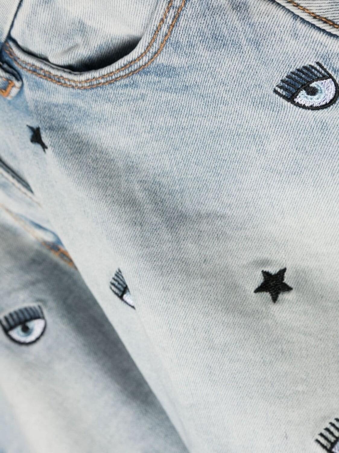 Голубой, смесовый хлопок, деним, вышивка, знаковый декор Eyelike, петли для ремня, потайная застежка на молнии и пуговицах, пять карманов и расклешенный подол.