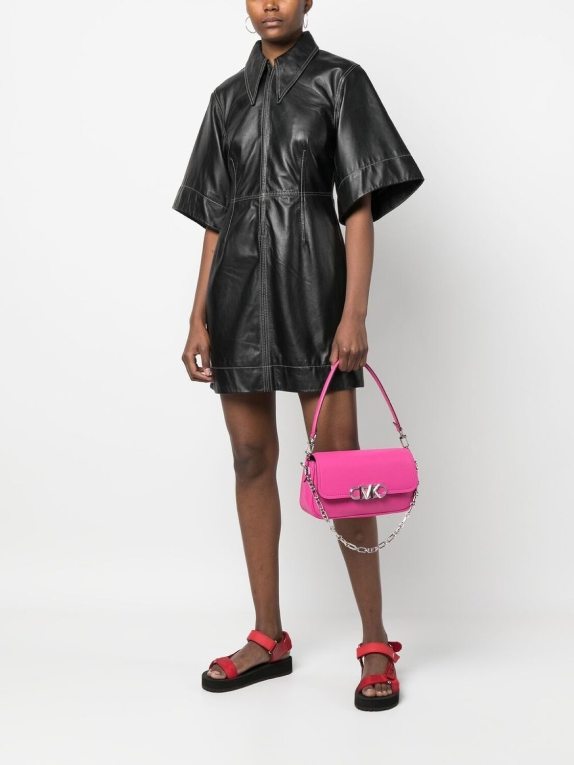 Ярко-розовый, телячья кожа, серебристый металлический логотип, цепочный ремень, съемный регулируемый ремень на плечо, откидной клапан на магните, основное отделение, подкладка с логотипами, нашивка с логотипом внутри и внутренний карман на молнии.