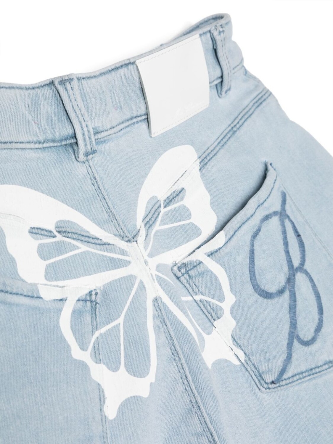 Эластичный хлопок, эффект кислотной стирки, декор в виде бабочки, вышитый логотип сзади, застежка на молнии и пуговице спереди, пять карманов и необработанные края.