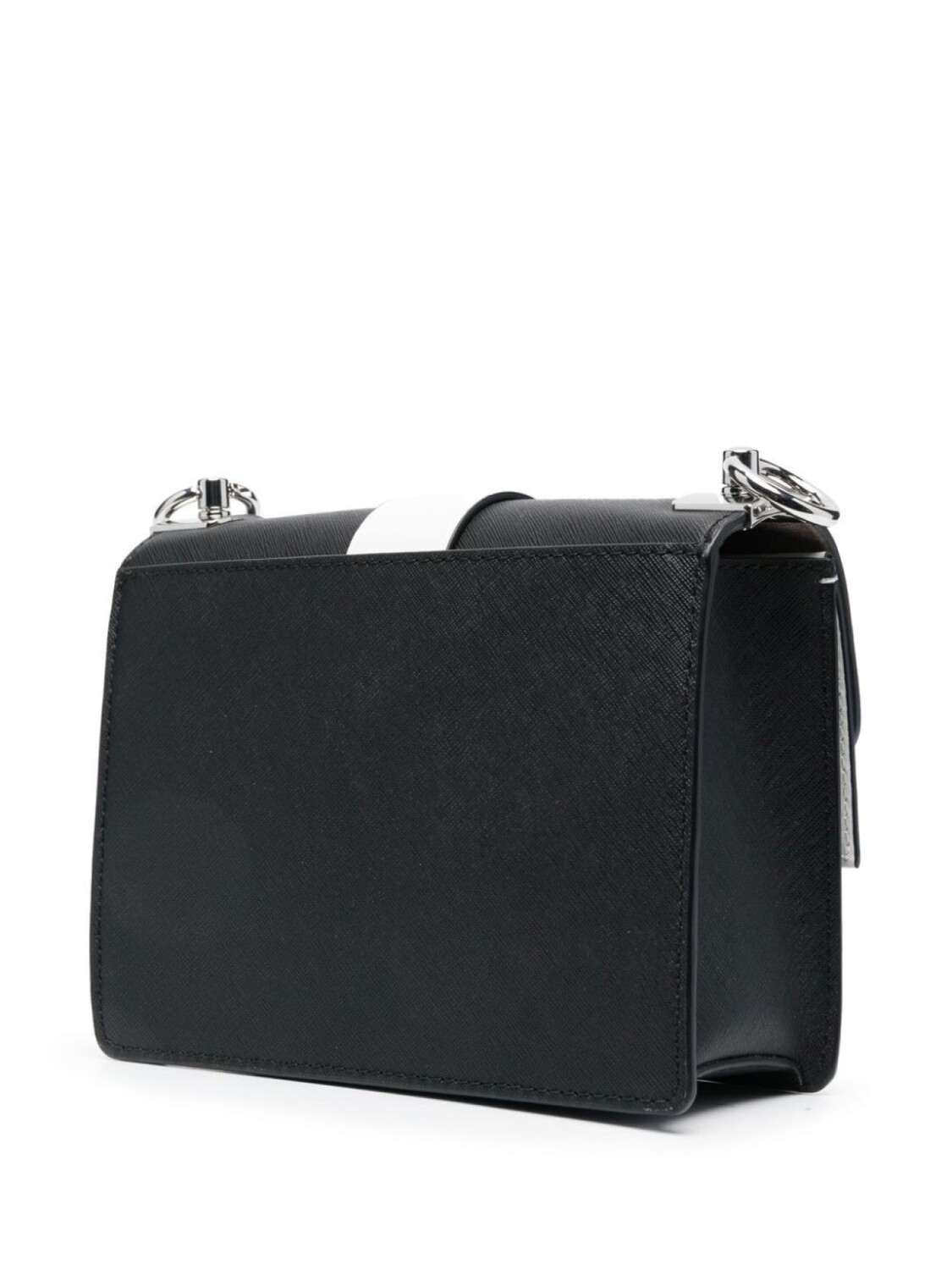 Черный/белый, телячья кожа, дизайн колор-блок, серебристый металлический логотип, откидной верх с застежкой на кнопки, клетчатый узор, съемный ремень на плечо, основное отделение и внутренние накладные карманы.