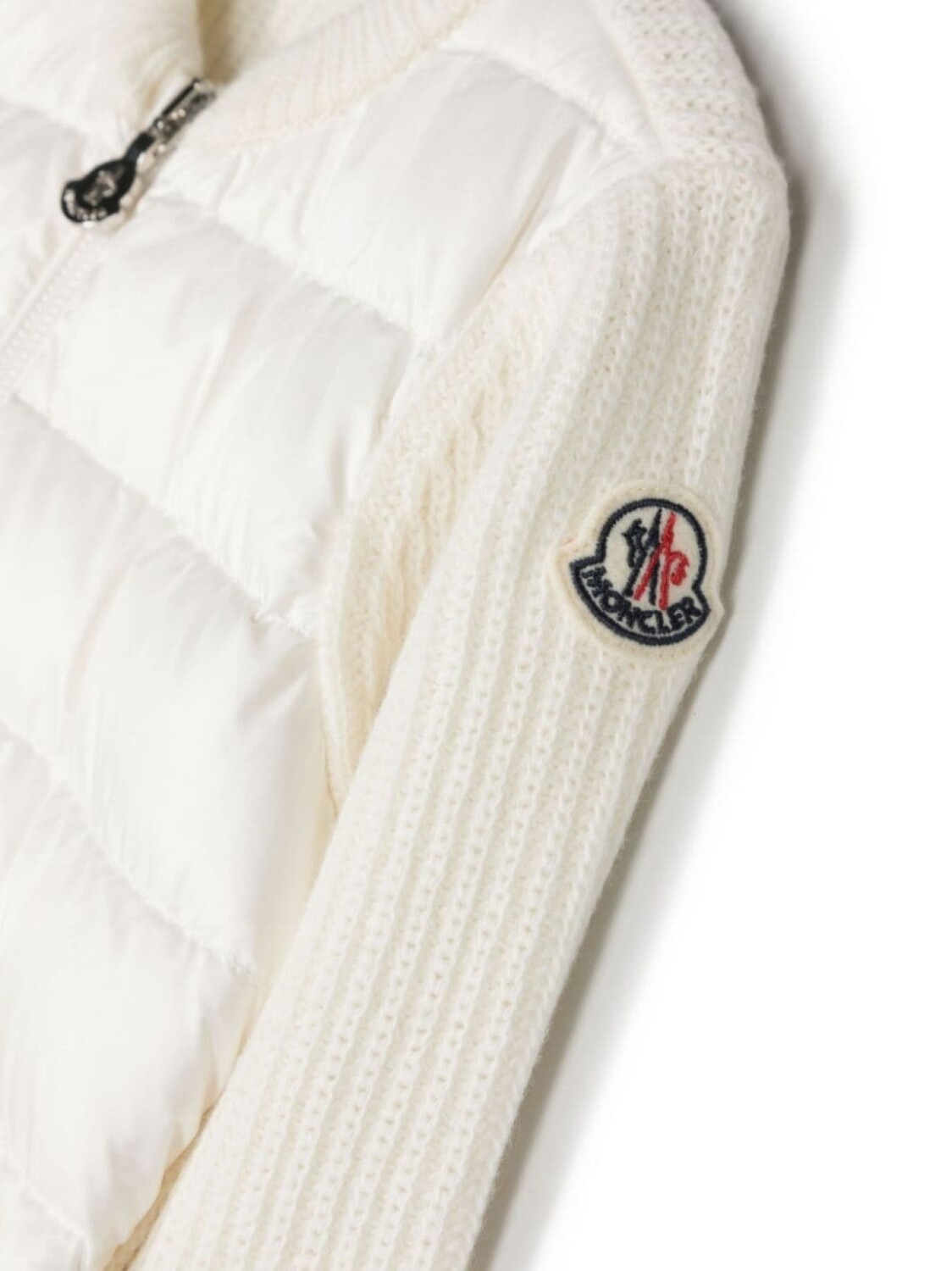 Белый, необработанная шерсть, хлопок, трикотажный материал, дутые вставки, нашивка с логотипом на рукаве, круглый вырез, застежка на молнии спереди, длинные рукава и прямой подол.