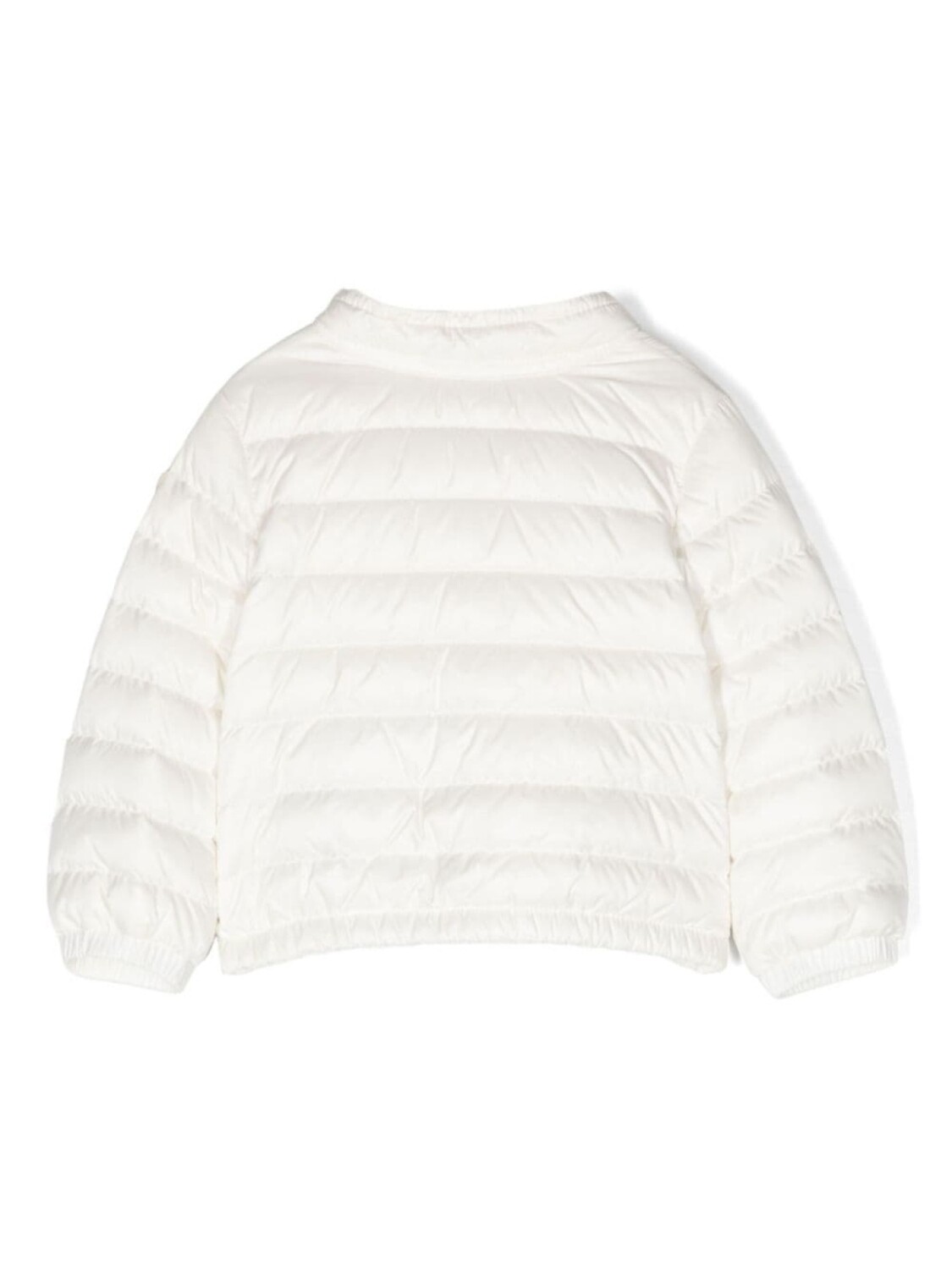 Белый, наполнитель из смеси пуха и пера, стеганная модель, дутый материал, нашивка с логотипом на рукаве, высокий воротник, застежка на шее, застежка на молнии спереди, длинные рукава с эластичными манжетами, два передних кармана на кнопке, эластичный подол, цельная подкладка
