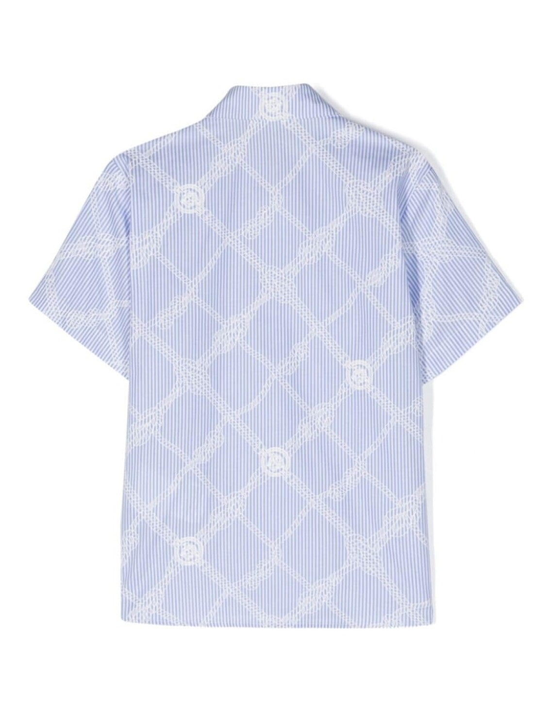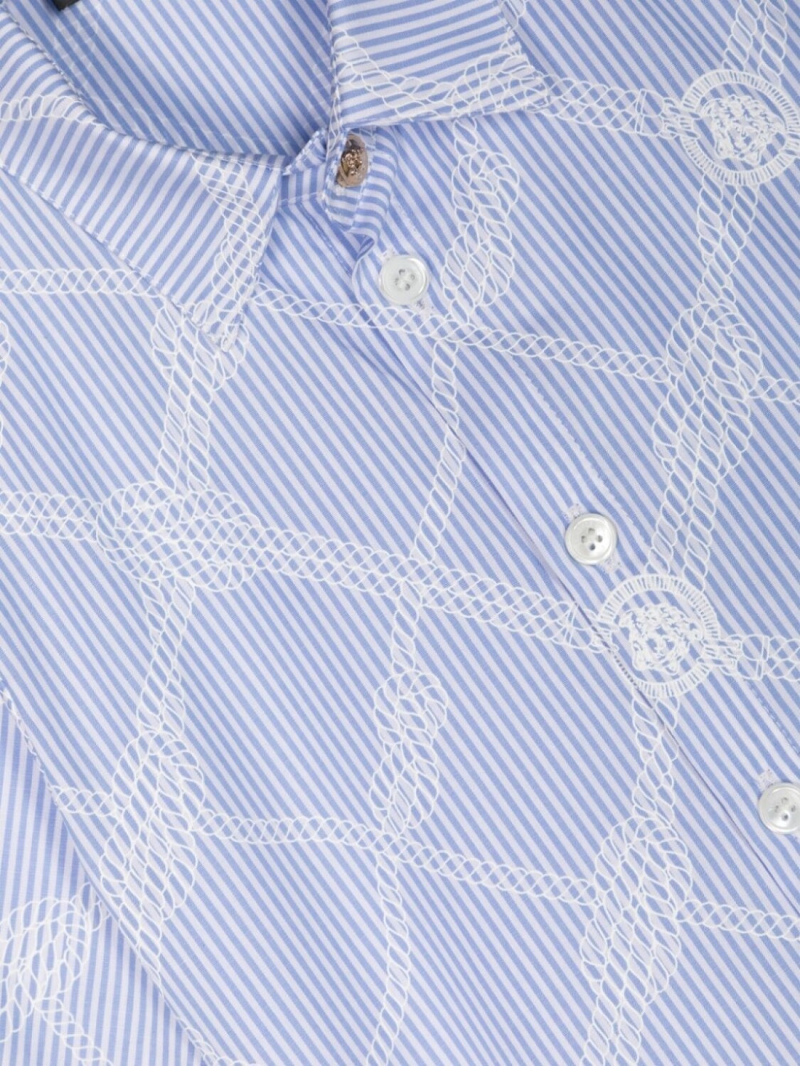 Белый, голубой, хлопок, поплин, узор в вертикальную полоску, сплошной принт, узор Medusa Head, классический воротник, застежка на пуговицах спереди, пуговицы с тисненым логотипом, короткие рукава, закругленный подол