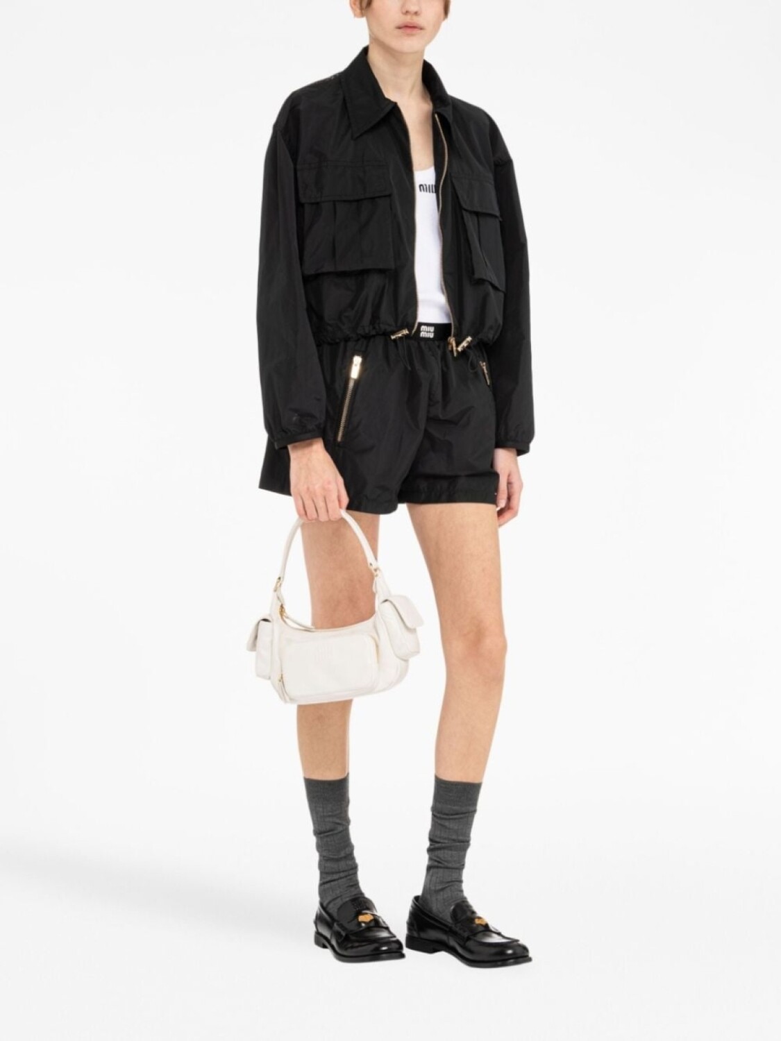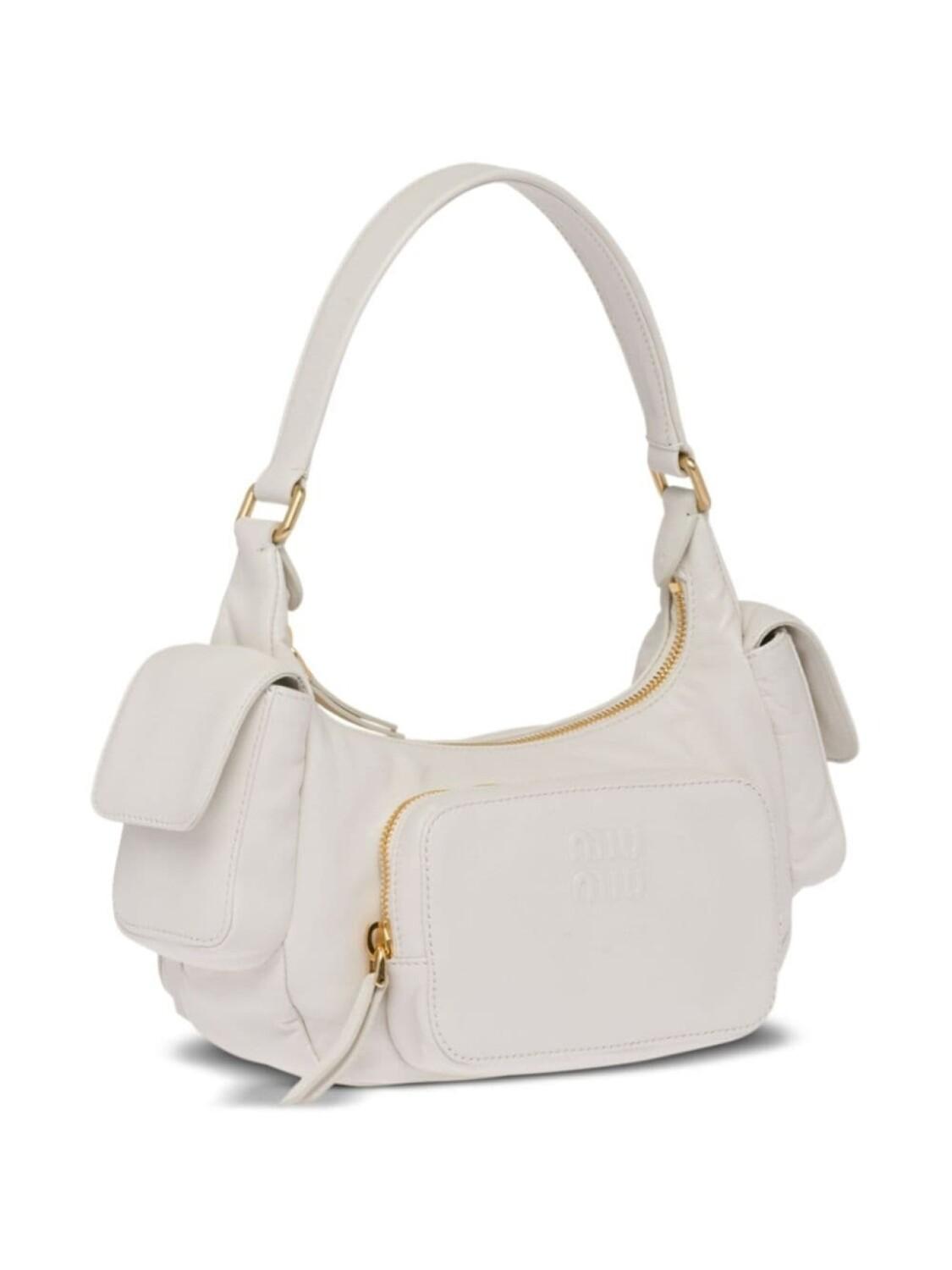 Белый, кожа наппа, тисненый логотип спереди, золотистая фурнитура, ремень на плечо, застежка на молнии сверху, карман на молнии спереди, два кармана с клапанами по бокам, основное отделение, внутренний карман на молнии и металлический логотип внутри.
