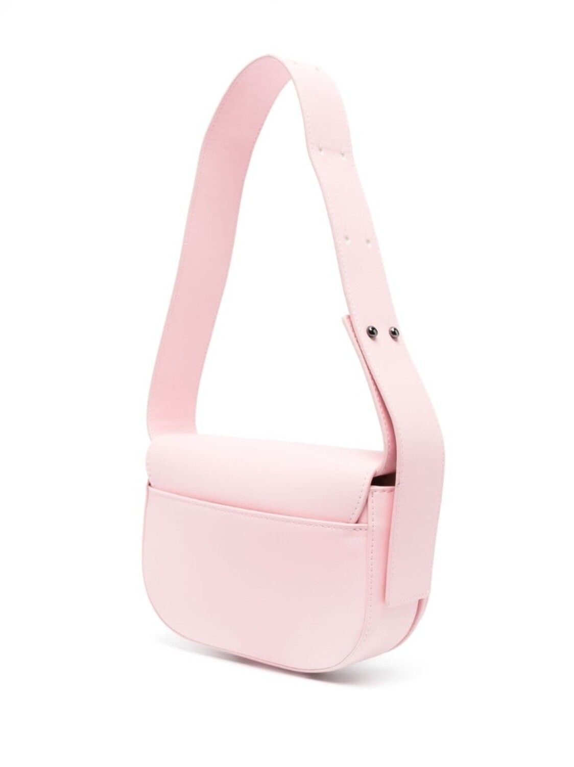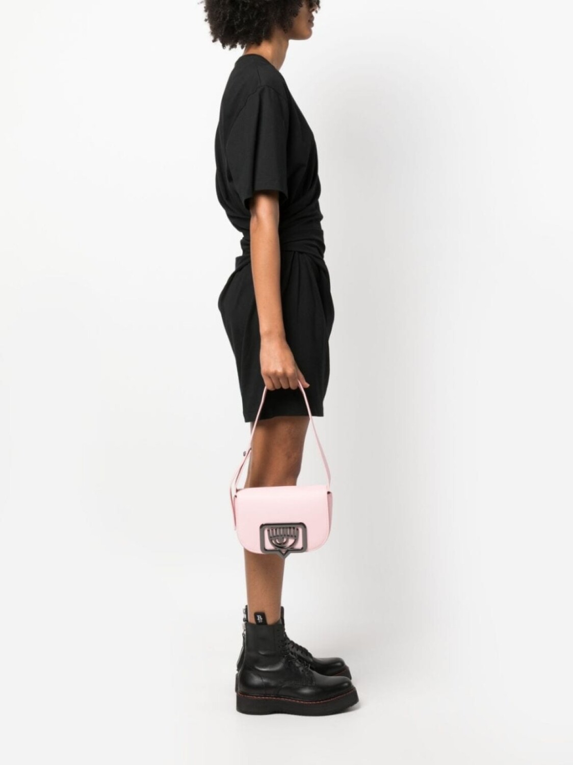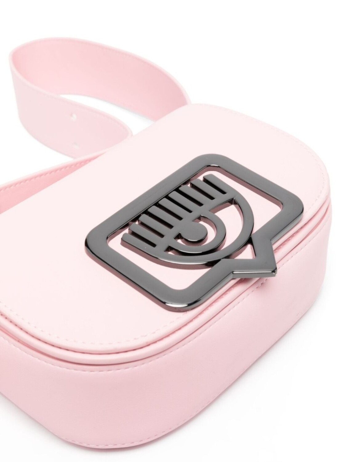 Светло-розовый, искусственная кожа, знаковый декор Eyelike, серебристый металлический логотип, серебристая фурнитура, откидной клапан и верхняя ручка.
