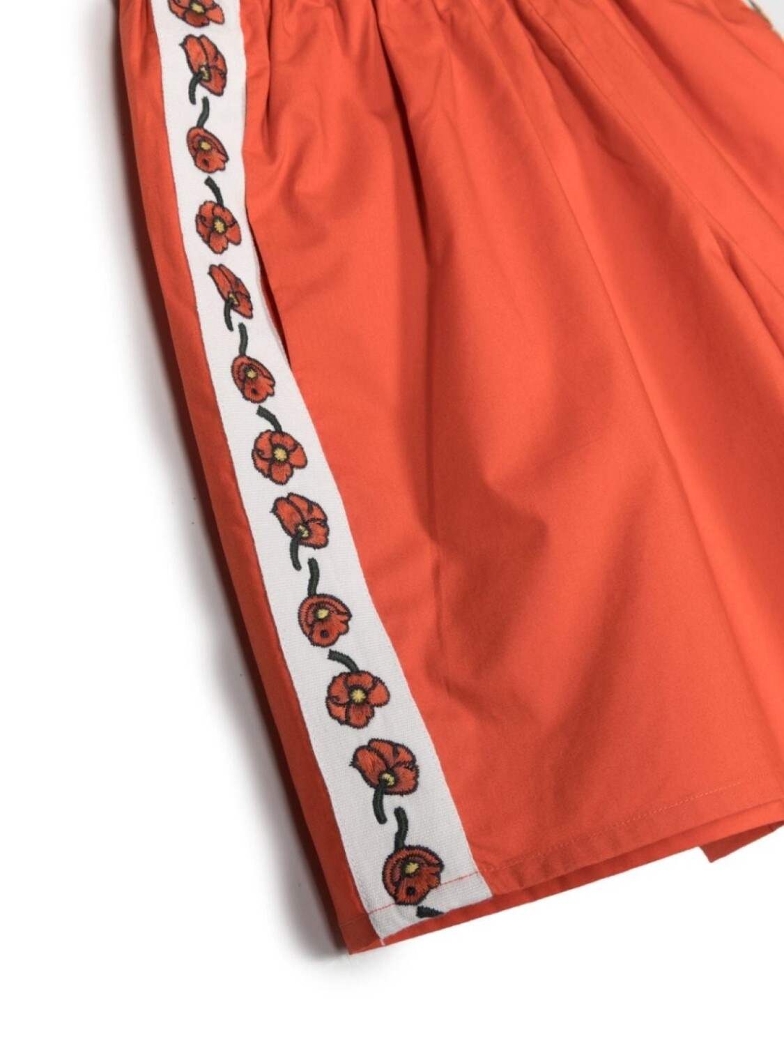 Кораллово-красный, хлопок, цветочный принт, эластичный пояс и длина выше колена.