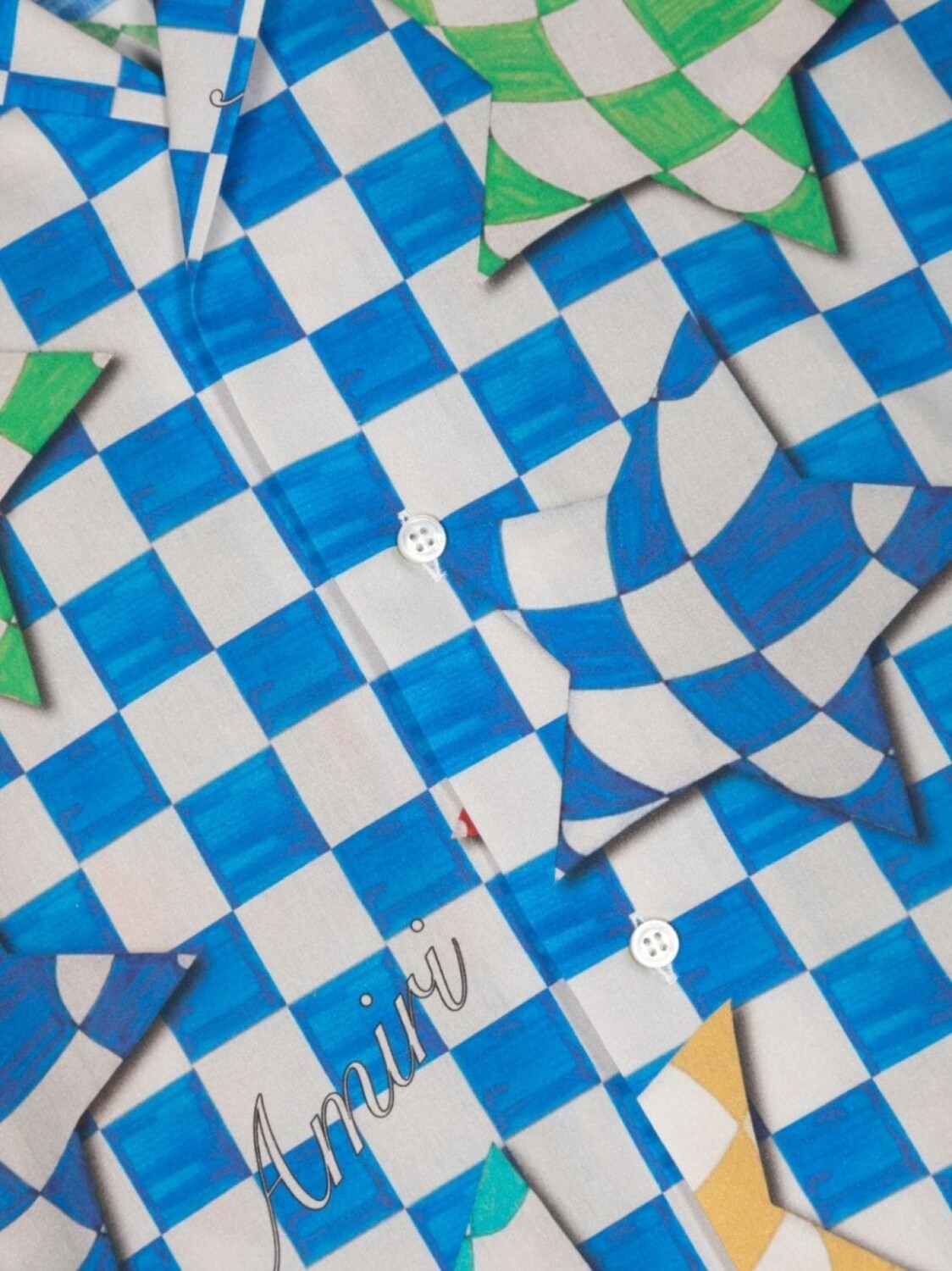 Синий, разноцветный, хлопок, дизайн колор-блок, сплошной принт с логотипом, клетчатый узор, принт с изображением звезд, заостренные лацканы, застежка на пуговицах спереди, короткие рукава и прямой подол.