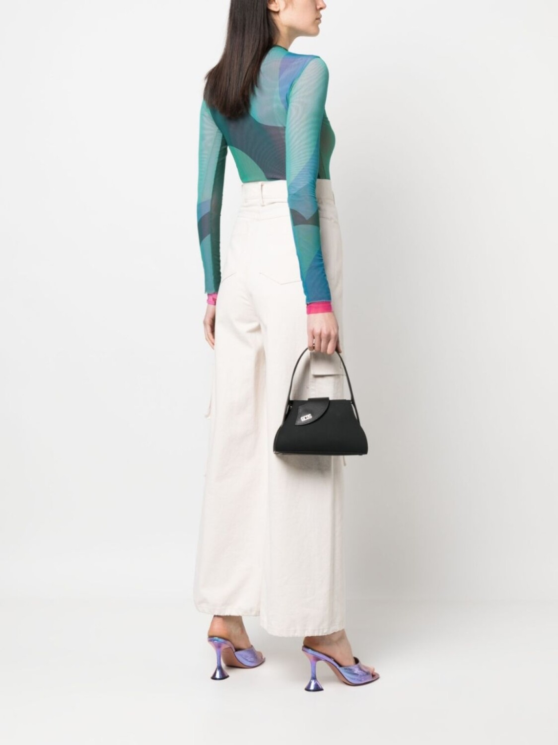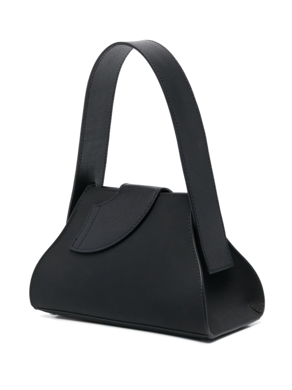 Черный, телячья кожа, серебристый логотип, тисненый логотип внутри, магнитная застежка, съемный регулируемый ремень на плечо, верхняя ручка, внутреннее отделение для карт, основное отделение, подкладка с логотипами и металлические ножки.