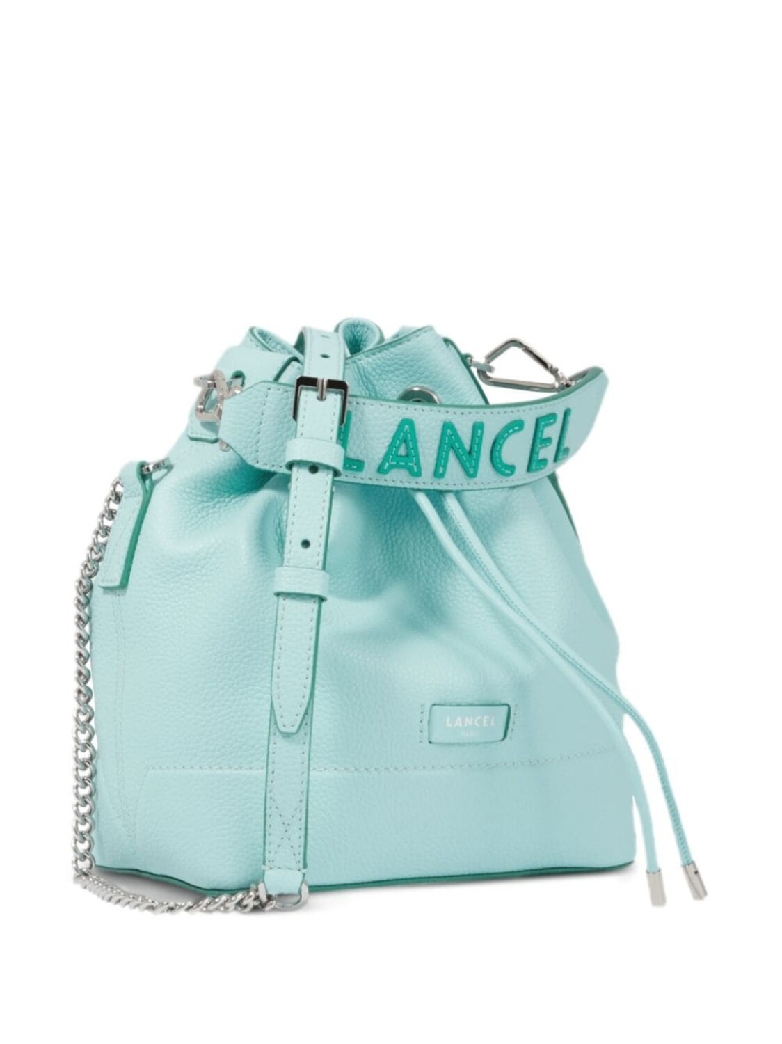 Голубой, кожа, зернистая текстура, логотип-аппликация, съемная верхняя ручка, ремень на плечо с цепочной деталью, верхняя застежка на шнурке, серебристая фурнитура, основное отделение, внутренний карман на молнии, парусиновая подкладка