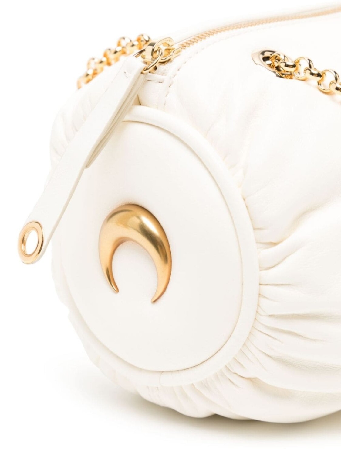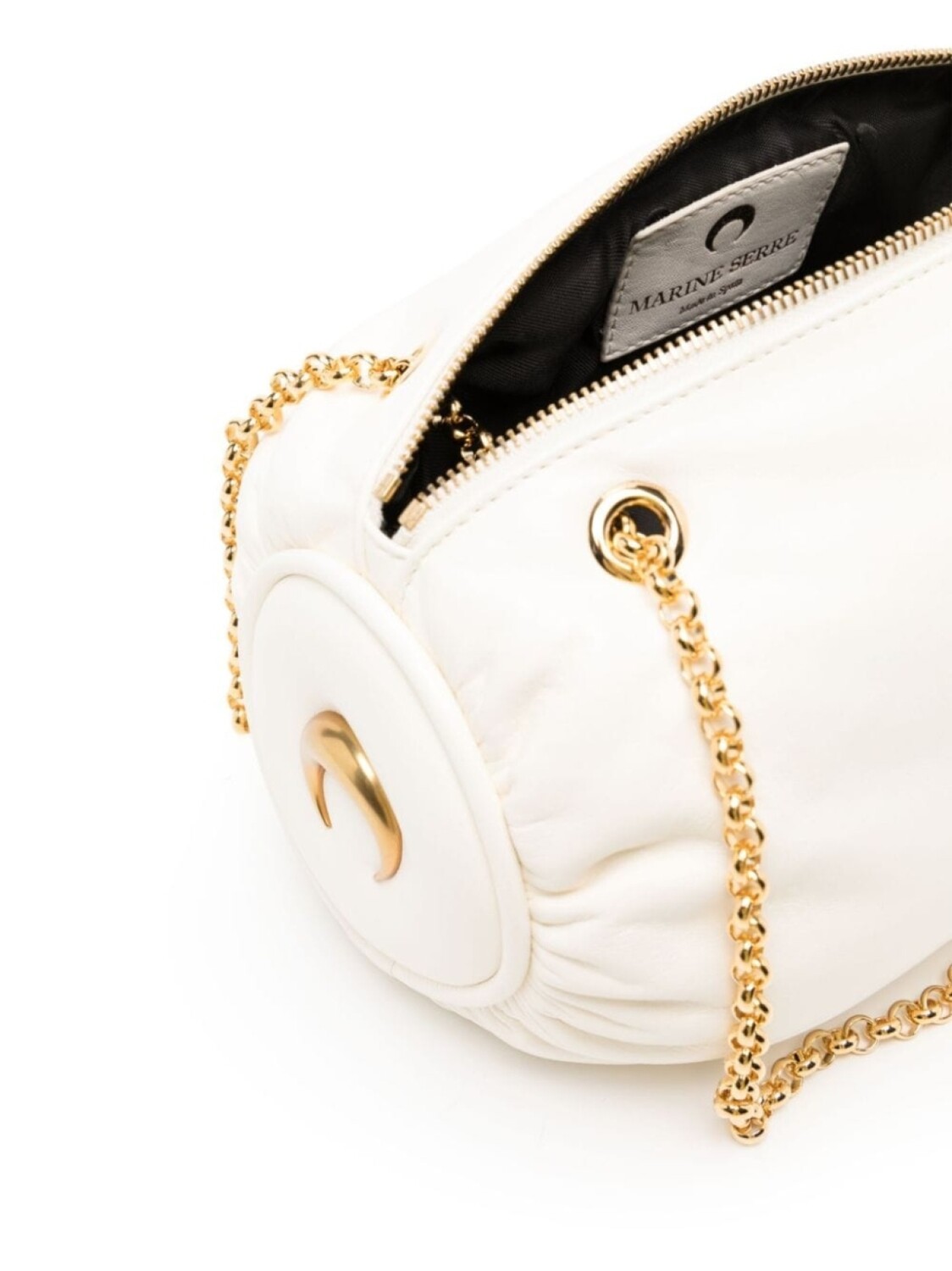 Два цепочных ремня на плечо, застежка на молнии сверху, основное отделение, нашивка с логотипом внутри и золотистая фурнитура.