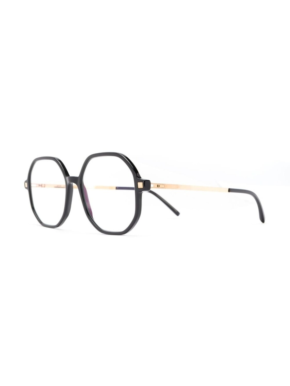 Очки Hilla от Mykita. Прямые дужки с изогнутыми концами, крепление на петлях, массивная оправа и внутреннее клеймо с логотипом. Модель в стиле унисекс.