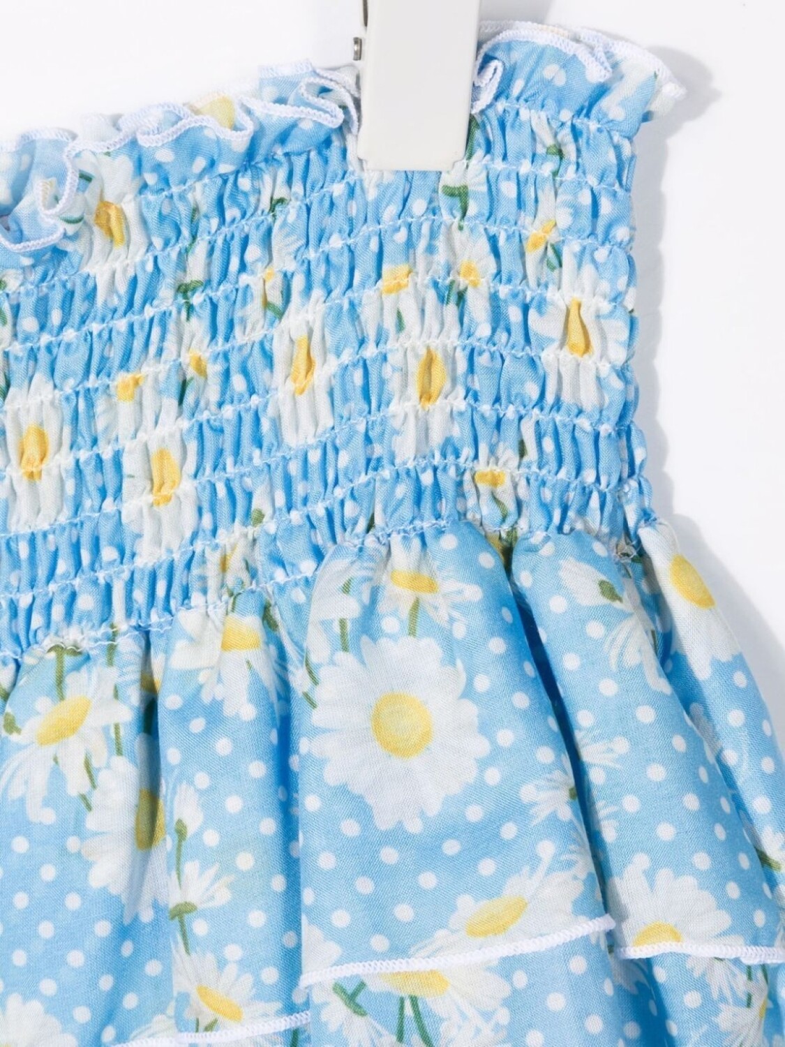 Сплошной цветочный принт, принт в горох, вставка со сборками и ярусная юбка. Цвет: синий.